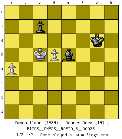 Last move : 1/2-1/2 2017 August 30 19:1:38 [Event "FICGS__CHESS__RAPID_B__000251"] [Site "FICGS"] [Date "2017.08.01"] [Round "1"] [White "Ambos,Ilmar"] [Black "Daanen,Aard"] [Result "1/2-1/2"] [WhiteElo "1889"] [BlackElo "1974"] 1.d4 Nf6 2.c4 g6 3.Nf3 Bg7 4.Nc3 O-O 5.e4 d6 6.Be2 e5 7.d5 a5 8.Bg5 h6 9.Bh4 Na6 10.O-O Qe8 11.Ne1 g5 12.Bg3 Nxe4 13.Nxe4 f5 14.Bh5 Qe7 15.f3 fxe4 16.fxe4 Rxf1+ 17.Kxf1 Nc5 18.Qe2 g4 19.Bxg4 Bxg4 20.Qxg4 Rf8+ 21.Nf3 Qg5 22.Qxg5 hxg5 23.Ke2 Bh6 24.Nd2 g4 25.Nb3 Nxe4 26.Nxa5 Nxg3+ 27.hxg3 Ra8 28.b4 b6 29.Nb3 Ra3 30.Kd3 Kf7 31.Kc2 Bg7 32.Kb2 Ra8 33.Re1 e4 34.Kb1 Ra4 35.Rxe4 Rxb4 36.Rxg4 Be5 37.Rh4 Kg6 38.c5 Rxh4 39.gxh4 dxc5 40.g4 Bf6 41.Nd2 Bxh4 42.Ne4 Bf6 43.Kc2 Kf7 44.Kd3 Bd4 45.a4 Ke7 46.Nd2 Bf2 47.Kc4 Bg3 48.Ne4 Bf4 49.Kb5 Be5 50.g5 Bf4 51.g6 Be5 52.Ng5 Kf6 53.Ne4+ Kxg6 54.Nxc5 bxc5 55.Kxc5 1/2-1/2 King's Indian, 3.Nf3 Kingside Castling by player Black (move 4) Kingside Castling by player White (move 10) 10 pieces endgame at move 41 : White KNPPP , Black KBPPP WHITE : King + 1 Knight 3 Pawns BLACK : King + 1 Bishop 3 Pawns 9 pieces endgame at move 53 : White KNPP , Black KBPPP WHITE : King + 1 Knight 2 Pawns BLACK : King + 1 Bishop 3 Pawns 8 pieces endgame at move 54 : White KNPP , Black KBPP WHITE : King + 1 Knight 2 Pawns BLACK : King + 1 Bishop 2 Pawns 7 pieces endgame at move 54 : White KPP , Black KBPP WHITE : King + 2 Pawns BLACK : King + 1 Bishop 2 Pawns 6 pieces endgame at move 55 : White KPP , Black KBP WHITE : King + 2 Pawns BLACK : King + 1 Bishop 1 Pawn This chess game ended in a draw. Follow this game move after move (download)The way he plays Chess demonstrates a man's whole nature. (Stanley Ellin) Schach ist eine Sache der genauen Beurteilung, wann man zuschlagen und wann man sich ducken muss. (Robert James Fischer) El Ajedrez demanda una total concentración. (Bobby Fischer) Aux échecs, l'amour-propre est satisfait quand on remporte la victoire, mais il n'y a pas de honte à être battu. (Benjamin Franklin) Yoga is 99% practice and 1% knowledge. (Sri Krishna Pattabhi Jois)