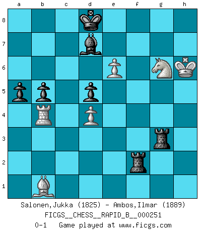 Last move : 0-1 2017 October 9 9:15:45 [Event "FICGS__CHESS__RAPID_B__000251"] [Site "FICGS"] [Date "2017.08.01"] [Round "1"] [White "Salonen,Jukka"] [Black "Ambos,Ilmar"] [Result "0-1"] [WhiteElo "1825"] [BlackElo "1889"] 1.e4 e6 2.d4 d5 3.e5 c5 4.c3 Nc6 5.Nf3 Qb6 6.Qb3 Qxb3 7.axb3 cxd4 8.cxd4 Bd7 9.Bd2 f6 10.Nc3 Bb4 11.Nb5 Bxd2+ 12.Kxd2 Ke7 13.Bd3 a6 14.Rhe1 g5 15.h3 h5 16.Na3 Rf8 17.exf6+ Rxf6 18.Ke3 Nh6 19.Nxg5 Nb4 20.Bb1 Rg8 21.f4 h4 22.Rg1 e5 23.fxe5 R6f8 24.Nf3 Bxh3 25.Nxh4 Rg3+ 26.Ke2 Bg4+ 27.Ke1 Bh5 28.Rh1 Re3+ 29.Kd2 Rf2+ 30.Kc1 R3e2 31.Rd1 Bg4 32.g3 Nf5 33.Nb5 Ne3 34.Nc3 Rxb2 35.Re1 Rxb3 36.Rxe3 Rf1+ 37.Re1 Rxe1+ 38.Kd2 Rh1 39.Ng6+ Kd8 40.Ra4 Rh2+ 41.Ke3 Rxc3+ 42.Kf4 Bd7 43.Rxb4 Rf2+ 44.Kg5 Rxg3+ 45.Kh6 b5 46.e6 a5 0-1 French : Advance, Paulsen attack Player Black won this chess game. Follow this game move after move (download)There just isn't enough televised Chess. (David Letterman) Drei Punkte vor allen anderen ist wie einer, der im weißen Anzug posiert, während der Rest in Müllsäcke gekleidet dasteht. (Viktor Kortschnoi) ¿Se han dado cuenta de que Fischer casi nunca ha tenido piezas malas? El las intercambia y las piezas malas se quedan con sus oponenets. (Yuri Balashov) Le plus grand jeu de l'esprit jamais inventé, plus vous l'apprenez, plus vous y prenez du plaisir. (Garry Kasparov) When the going gets tactical, the computers get going. (Hyatt)