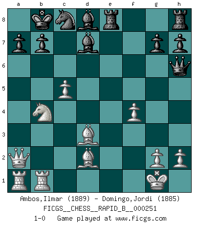 Last move : 1-0 2017 November 1 9:29:23 [Event "FICGS__CHESS__RAPID_B__000251"] [Site "FICGS"] [Date "2017.08.01"] [Round "1"] [White "Ambos,Ilmar"] [Black "Domingo,Jordi"] [Result "1-0"] [WhiteElo "1889"] [BlackElo "1885"] 1.e4 e5 2.Nf3 f5 3.Nxe5 Qf6 4.d4 d6 5.Nc4 fxe4 6.Nc3 Qg6 7.f3 Be7 8.Nxe4 Nf6 9.Ng3 Qf7 10.Bd3 Nc6 11.c3 Be6 12.Ne3 O-O-O 13.O-O Kb8 14.Qc2 Nh5 15.Nxh5 Qxh5 16.b4 Bf6 17.a4 Rde8 18.a5 Ne7 19.b5 Nd5 20.b6 cxb6 21.axb6 Nxb6 22.Bd2 Bg5 23.f4 Bd8 24.c4 Bd7 25.Rfb1 Qh6 26.Qa2 Nc8 27.Nd5 Bc6 28.Nb4 Bd7 29.c5 dxc5 30.dxc5 1-0 Latvian counter-gambit Queenside Castling by player Black (move 12) Kingside Castling by player White (move 13) Player White won this chess game. Follow this game move after move (download)Fischer is under obligation to nobody. (Joseph Platz) Schachspieler können ausgezeichnet Varianten am Schachbrett berechnen, aber nicht im realen Leben. Zu stark ist der Individualismus im Schach ausgeprägt, und für viele ist ein kleiner momentaner persönlicher Vorteil wichtiger als ein weit größerer Vorteil von morgen. (Anatoly Karpov) Aquellos que dicen entender al Ajedrez, no entienden nada. (Robert Hubner) Si je n'étais pas joueur d'échecs, je serais le meilleur dans quelque chose d'autre. (Anatoli Karpov) The Internet is the first thing that humanity has build that humanity doesn't understand, the largest experiment in anarchy that we have ever had. (Eric Schmidt)