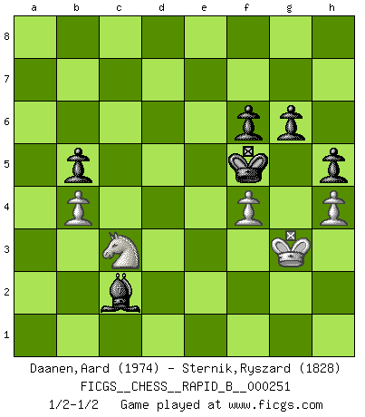 Last move : 1/2-1/2 2017 August 31 22:2:38 [Event "FICGS__CHESS__RAPID_B__000251"] [Site "FICGS"] [Date "2017.08.01"] [Round "1"] [White "Daanen,Aard"] [Black "Sternik,Ryszard"] [Result "1/2-1/2"] [WhiteElo "1974"] [BlackElo "1828"] 1.d4 Nf6 2.c4 e6 3.Nc3 d5 4.Bg5 Be7 5.e3 O-O 6.Rc1 h6 7.Bh4 b6 8.cxd5 Nxd5 9.Nxd5 exd5 10.Bxe7 Qxe7 11.Be2 c5 12.Bf3 cxd4 13.Qxd4 Bb7 14.Ne2 Nc6 15.Qa4 Ne5 16.O-O Nxf3+ 17.gxf3 d4 18.Nxd4 Rfe8 19.Qb5 Qd6 20.Qf5 Re5 21.Qh3 Rd8 22.f4 Qd5 23.Qf3 Rd6 24.Qxd5 Rg6+ 25.Kh1 Bxd5+ 26.f3 Rxe3 27.a3 Rf6 28.f5 Rd3 29.Rcd1 Rxd1 30.Rxd1 Rxf5 31.Kg2 Re5 32.Kg3 Kh7 33.h4 Kg6 34.Rd3 Kf6 35.b4 Bc4 36.Rc3 b5 37.a4 a6 38.axb5 axb5 39.Nc2 Rd5 40.f4 Ke6 41.Kf3 Rd2 42.Na3 Bf1 43.Nc2 Rd3+ 44.Rxd3 Bxd3 45.Na3 g6 46.Ke3 Bf1 47.Kf2 Bc4 48.Ke3 Kd5 49.Nb1 Bf1 50.Na3 h5 51.Kf2 Bd3 52.Ke3 Bc4 53.Nb1 Bb3 54.Na3 Ba4 55.Kd3 Ke6 56.Ke2 Kf5 57.Kf3 f6 58.Nb1 Bd1+ 59.Kg3 Bc2 60.Nc3 1/2-1/2 Queen's pawn game Kingside Castling by player Black (move 5) Kingside Castling by player White (move 16) This chess game ended in a draw. Follow this game move after move (download)Chess is a foolish expedient for making idle people believe they are doing something very clever when they are only wasting their time. (George Bernard Shaw) Es gibt zwei Arten von Opfern: Korrekte und meine. (Mikhail Nekhemyevich Tal) Con el fin de mejorar tu juego, debes de estudiar los finales antes que todo, ya que mientras que los finales pueden ser estudiados y dominados por sí mismos, el juegomedio y la apertura deben de ser estudiados en relación con los finales. (José Raúl Capablanca) Les réformistes prétendent que les progrès de la théorie conduiront à la disparition des échecs, et qu'il faut, pour leur rendre vie, en remanier les règles. En réalité, qu'exprime cette affirmation? Le mépris de l'intuition, de l'imagination et de tous les autres éléments qui font des échecs un art. (Alexander Alekhine) Always two there are. No more no less. A master, and an apprentice. (Master Yoda in Star Wars ep.1)