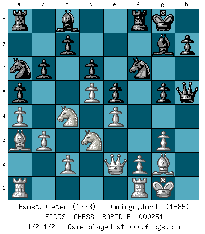 Last move : 1/2-1/2 2017 September 25 16:50:51 [Event "FICGS__CHESS__RAPID_B__000251"] [Site "FICGS"] [Date "2017.08.01"] [Round "1"] [White "Faust,Dieter"] [Black "Domingo,Jordi"] [Result "1/2-1/2"] [WhiteElo "1773"] [BlackElo "1885"] 1.Nf3 f5 2.g3 Nf6 3.Bg2 g6 4.d4 Bg7 5.O-O O-O 6.b3 d6 7.Bb2 Qe8 8.Nbd2 Nc6 9.Re1 e5 10.e4 f4 11.d5 fxg3 12.hxg3 Nb8 13.Qe2 a5 14.a4 b6 15.Nc4 Na6 16.Ba3 Ng4 17.Rf1 Nf6 18.Ne1 g5 19.Nd3 Qh5 1/2-1/2 Reti v Dutch Kingside Castling by player White (move 5) Kingside Castling by player Black (move 5) This chess game ended in a draw. Follow this game move after move (download)Bobby Fischer's current state of mind is indeed a tragedy. One of the world's greatest Chess players - the pride and sorrow of American Chess. (Frank Brady) Dein Körper muss in Topform sein. Dein Schach verfällt, wenn dein Körper verfällt. Der Körper kann nicht vom Geist getrennt werden. (Robert James Fischer) Tu no necesitas jugar muy bien, únicamente ayudar a tu oponenet a que juegue muy mal. (Genrikh Chepukaitis) Les Echecs sont et restent toujours un combat, un combat intégral comme la boxe, la lutte ou un autre sport, et où il doit y avoir un vainqueur et un vaincu. (Joseph Emil Diemer) CHESS, n. f. [echecs, Fr.] A nice and abstruse game, in which two sets of puppets are moved in opposition to each other. (Dr Samuel Johnson, A Dictionary Of The English Language, 1755)