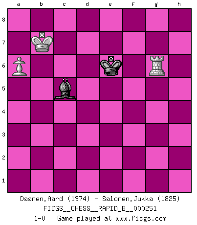 Last move : 1-0 2017 October 2 7:14:33 [Event "FICGS__CHESS__RAPID_B__000251"] [Site "FICGS"] [Date "2017.08.01"] [Round "1"] [White "Daanen,Aard"] [Black "Salonen,Jukka"] [Result "1-0"] [WhiteElo "1974"] [BlackElo "1825"] 1.e4 e5 2.Nf3 Nc6 3.Bc4 Bc5 4.O-O Nf6 5.d3 d6 6.c3 O-O 7.Nbd2 a6 8.a4 Ba7 9.h3 Bd7 10.b4 h6 11.Re1 Ne7 12.d4 Ng6 13.Bb2 Re8 14.Qb3 Re7 15.b5 Qe8 16.bxa6 bxa6 17.Bxa6 Rb8 18.Qc2 d5 19.exd5 e4 20.Ba3 exf3 21.Bxe7 Nxe7 22.Nxf3 Nfxd5 23.a5 c5 24.Rab1 cxd4 25.cxd4 Be6 26.Bc4 Rxb1 27.Rxb1 Qc6 28.Rb2 Bf5 29.Qb3 Be4 30.Qb5 Qg6 31.Qa6 Qxa6 32.Bxa6 Nf4 33.Bb7 Nc6 34.Bxc6 Bxc6 35.Rc2 Bxf3 36.Rc8+ Kh7 37.gxf3 Nxh3+ 38.Kf1 Bxd4 39.Rc4 Ba7 40.Rc7 Bd4 41.Rxf7 Ng5 42.Rd7 Nxf3 43.Ke2 Ng1+ 44.Kd3 Bxf2 45.Rf7 Bc5 46.Kc4 Be3 47.a6 h5 48.Rf5 Ba7 49.Rxh5+ Kg8 50.Rc5 Nf3 51.Rc7 Bb6 52.Rc8+ Kf7 53.Kb5 Bf2 54.Rc1 Nd4+ 55.Ka4 Nf3 56.Rf1 Ba7 57.Rxf3+ Ke6 58.Kb5 g5 59.Kc6 Ke5 60.Kb7 Bd4 61.Rb3 g4 62.Rb5+ Ke6 63.Rg5 Be3 64.Rxg4 Bc5 65.Rg6+ 1-0 Giuoco Piano Kingside Castling by player White (move 4) Kingside Castling by player Black (move 6) 10 pieces endgame at move 41 : White KRPPP , Black KBNPP WHITE : King + 1 Rook 3 Pawns BLACK : King + 1 Bishop 1 Knight 2 Pawns 9 pieces endgame at move 42 : White KRPP , Black KBNPP WHITE : King + 1 Rook 2 Pawns BLACK : King + 1 Bishop 1 Knight 2 Pawns 8 pieces endgame at move 44 : White KRP , Black KBNPP WHITE : King + 1 Rook 1 Pawn BLACK : King + 1 Bishop 1 Knight 2 Pawns 7 pieces endgame at move 49 : White KRP , Black KBNP WHITE : King + 1 Rook 1 Pawn BLACK : King + 1 Bishop 1 Knight 1 Pawn 6 pieces endgame at move 57 : White KRP , Black KBP WHITE : King + 1 Rook 1 Pawn BLACK : King + 1 Bishop 1 Pawn 5 pieces endgame at move 64 : White KRP , Black KB WHITE : King + 1 Rook 1 Pawn BLACK : King + 1 Bishop Player White won this chess game. Follow this game move after move (download)One bad move nullifies forty good ones. (Horowitz) Nicht daß Diemer aus Opportunismus Mitglied der NSDAP geworden wäre. Er war ein Fanatiker, in allem, was er tat. (Hans Ree) En la vida, como en el Ajedrez, los Peones propios obstruyen nuestro camino. La gran fortuna de un hombre, su comodidad, placer, hijos, libros, que deberían ayudarle a ganar, con mucha frecuencia lo ponen en Jaque Mate. (Charles Buxton) Les échecs, c'est la lutte contre l'erreur. (Johannes Zukertort) Horse racing is animated roulette. (Roger Kahn)