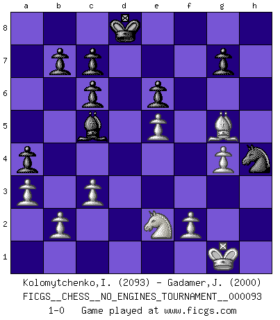 Last move : 1-0 2018 January 21 10:1:20 [Event "FICGS__CHESS__NO_ENGINES_TOURNAMENT__000093"] [Site "FICGS"] [Date "2017.08.05"] [Round "1"] [White "Kolomytchenko,Igor"] [Black "Gadamer,Juan Geremia"] [Result "1-0"] [WhiteElo "2093"] [BlackElo "2000"] 1.e4 e5 2.Nf3 Nc6 3.Bb5 Nf6 4.O-O Nxe4 5.d4 Nd6 6.Bxc6 dxc6 7.dxe5 Nf5 8.Qxd8+ Kxd8 9.Nc3 Ke8 10.h3 h5 11.Rd1 Be7 12.Bf4 Be6 13.a3 a5 14.Rd2 Rd8 15.Rxd8+ Kxd8 16.Rd1+ Kc8 17.Ng5 Rd8 18.Rxd8+ Kxd8 19.Nxe6+ fxe6 20.Ne2 Bc5 21.c3 a4 22.g4 hxg4 23.hxg4 Nh4 24.Bg5+ 1-0 Ruy Lopez : Berlin defense, Open variation Kingside Castling by player White (move 4) Player White won this chess game. Follow this game move after move (download)Chess opens and enriches your mind. (Saudin Robovic) Fischer: 'Remis!?' Uhlmann: 'Aber es muss doch dreimal Zugwiederholung sein!' Fischer: 'Sie nehmen das Remis an, wie ich es sage, sonst spiele ich weiter und werde Sie dann schlagen!' (Robert James Fischer) Las leyes del Ajedrez no permiten una libre elección: tienes que mover quieras o no. (Emanuel Lasker) Il n'y a plus de joueurs du niveau de Jacob Murray dont la seule quête est le beau jeu, le plaisir de voir les pièces construire quelque chose. Sur 10 idées à la minute, 9 seront sans intérêt, la dernière s'avèrera géniale. (Christian Bauer) Men never do evil so completely and cheerfully as when they do it from religious conviction. (Blaise Pascal)