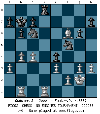 Last move : 1-0 2018 January 3 2:37:35 [Event "FICGS__CHESS__NO_ENGINES_TOURNAMENT__000093"] [Site "FICGS"] [Date "2017.08.05"] [Round "1"] [White "Gadamer,Juan Geremia"] [Black "Foster,Duncan"] [Result "1-0"] [WhiteElo "2000"] [BlackElo "1638"] 1.Nf3 b6 2.c4 Bb7 3.g3 g6 4.Bg2 Bg7 5.O-O d6 6.d4 e5 7.dxe5 dxe5 8.Qxd8+ Kxd8 9.Ng5 Bxg2 10.Kxg2 Nh6 11.Nc3 Nc6 12.e3 Ke7 13.Nd5+ Kd7 14.Rd1 Kc8 15.Rb1 Kb7 16.a3 Rad8 17.b4 f6 18.Ne6 Rd7 19.Nxg7 Rxg7 20.Nxf6 Rf7 21.Nd5 Rd8 22.Bb2 e4 23.h3 Nf5 24.Nf6 Rxf6 25.Bxf6 1-0 Reti Opening Kingside Castling by player White (move 5) Player White won this chess game. Follow this game move after move (download)The battle for the ultimate truth will never be won. And that's why Chess is so fascinating. (Hans Kmoch) Rauchen ist dem Schachspieler bei seiner Arbeit, also im Wettkampf, untersagt. (Viktor Kortschnoi) No todos los artistas son jugadores de Ajedrez, pero todos los jugadores de Ajedrez son artistas. (Marcel Duchamp) Si rien de grave n'est détecté lors de l'analyse d'une position, on joue alors le coup. Seconde règle de Blumenfeld. It is a good thing for an uneducated man to read books of quotations. (Winston Churchill)