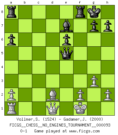 Last move : 0-1 2017 November 5 10:21:17 [Event "FICGS__CHESS__NO_ENGINES_TOURNAMENT__000093"] [Site "FICGS"] [Date "2017.08.05"] [Round "1"] [White "Vollmer,Steve"] [Black "Gadamer,Juan Geremia"] [Result "0-1"] [WhiteElo "1524"] [BlackElo "2000"] 1.Nf3 Nf6 2.d4 e6 3.g3 d5 4.Bg2 Be7 5.O-O O-O 6.c4 dxc4 7.Nc3 Nbd7 8.e4 b5 9.e5 Nd5 10.Nxb5 Bb7 11.Bd2 a6 12.Nc3 c5 13.b3 cxd4 14.Nxd5 Bxd5 15.bxc4 Bxc4 16.Re1 Bd5 17.Nxd4 Bxg2 18.Kxg2 Nxe5 19.Nxe6 Qd5+ 20.Kf1 fxe6 21.Rxe5 Qxe5 0-1 Reti Opening Kingside Castling by player White (move 5) Kingside Castling by player Black (move 5) Player Black won this chess game. Follow this game move after move (download)A win by an unsound combination, however showy, fills me with artistic horror. (Wilhelm Steinitz) Es macht mich traurig, wenn ich sehe, dass Golfprofis mehr verdienen als Schachsportler. Obwohl ich davon überzeugt bin, dass wir Schachspieler viel härter trainieren müssen als die Golfer. (Alexandra Kosteniuk) El Ajedrez es tan inspirador que yo no creo que un buen jugador sea capaz de tener un pensamiento malo durante una partida. (Wilhelm Steinitz) Il vaut mieux sacrifier les pièces de l'adversaire. (Xavier Tartacover) I fear not the man who has practiced 10,000 kicks once, but I fear the man who has practiced one kick 10,000 times. (Bruce Lee)