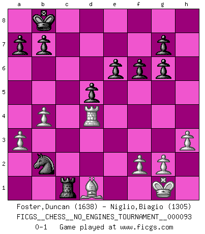 Last move : 0-1 2018 February 23 12:37:2 [Event "FICGS__CHESS__NO_ENGINES_TOURNAMENT__000093"] [Site "FICGS"] [Date "2017.08.05"] [Round "1"] [White "Foster,Duncan"] [Black "Niglio,Biagio"] [Result "0-1"] [WhiteElo "1638"] [BlackElo "1305"] 1.e4 c6 2.d4 d5 3.e5 Bf5 4.Nf3 e6 5.Be2 Nd7 6.O-O Ne7 7.Nh4 Bg6 8.Nd2 c5 9.c3 Nc6 10.Nxg6 hxg6 11.Nf3 Be7 12.h3 Qb6 13.Qd2 O-O-O 14.Qe3 cxd4 15.cxd4 Kb8 16.a3 Rc8 17.Ng5 Bxg5 18.Qxg5 Qxd4 19.Rd1 Qb6 20.b4 Nd4 21.Bg4 Nb3 22.Ra2 Nxc1 23.Rxc1 Rxc1+ 24.Qxc1 Nxe5 25.Qf4 Qc7 26.Be2 f6 27.Qd2 Rc8 28.Bd1 Qc1 29.Qxc1 Rxc1 30.Rd2 Nc4 31.Rd4 Nb2 0-1 Caro-Kann : Advance variation Kingside Castling by player White (move 6) Queenside Castling by player Black (move 13) Player Black won this chess game. Follow this game move after move (download)I won't play with you anymore. You have insulted my friend. - When an opponent cursed himself for a blunder. (Miguel Najdorf) Ich organisiere ein großes Turnier, was mich etwa 120000 Dollar kostet. Ich denke, das ist das erste Mal in der Schachgeschichte, daß ein Schachgroßmeister auch als Mäzen auftritt. (Miguel Najdorf) Una compensación adecuada por un sacrificio es tener una combinación sólida que conduce a una posición ganadora; una compensación adecuada por una metida de pata es dejar a tu oponente arrebatar una derrota de las fauces de la victoria. (Bruce A. Moon) Même si vous avez un bon coup à faire, regardez toujours s'il n'y en a pas un qui lui soit préférable. (Pedro Damiano) Tree pose grows confidence. It roots me to this world. (Terri Guillemets)