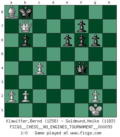 Last move : 1-0 2017 September 8 6:19:2 [Event "FICGS__CHESS__NO_ENGINES_TOURNAMENT__000093"] [Site "FICGS"] [Date "2017.08.05"] [Round "1"] [White "Klawitter,Bernd"] [Black "Goldmund,Heike"] [Result "1-0"] [WhiteElo "1258"] [BlackElo "1183"] 1.e4 d5 2.exd5 Qxd5 3.Nc3 Qa5 4.d4 Nf6 5.Bd2 c6 6.Nf3 Bf5 7.Ne4 Qc7 8.Nxf6+ gxf6 9.Nh4 Be6 10.Qc1 Bd5 11.c4 Be4 12.Be2 Nd7 13.f3 Bg6 14.Nxg6 hxg6 15.Kf1 Rxh2 16.Kg1 Rxh1+ 17.Kxh1 e6 18.Bf4 Bd6 19.Bxd6 Qxd6 20.Qe3 Qf8 21.Kg1 Ke7 22.Qa3+ c5 23.dxc5 Kd8 24.Rd1 Kc7 25.Rd6 Qh8 26.Qa5+ b6 27.Qb5 Ne5 28.f4 Qh4 29.Qb4 Nc6 30.Rxc6+ Kxc6 31.Bf3+ Kc7 32.cxb6+ axb6 33.Bxa8 Qxf4 34.Qe7+ Kb8 35.Qb7+ 1-0 Scandinavian (centre counter) defense Player White won this chess game. Follow this game move after move (download)Chess is a forcing house where the fruits of character can ripen more fully than in life. (Edward Morgan Foster) Deine Wertungszahl - vorausgesetzt einige Jahre schachliche Anstrengung - entspricht etwa dem zehnfachen Deines IQ plus 1000. (Jonathan Levitt) En el Ajedrez, tal como es jugado por los Maestros, practicamente la suerte es eliminada. (Emanuel Lasker) Toute estimation doit être constamment réévaluée. (Jacob Estrin) A married woman is like a fish riding a bicycle. (Rodolfo d'Ettorre)