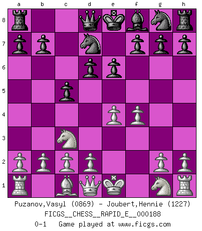 Last move : 0-1 2017 September 10 7:30:56 [Event "FICGS__CHESS__RAPID_E__000188"] [Site "FICGS"] [Date "2017.08.05"] [Round "1"] [White "Puzanov,Vasyl"] [Black "Joubert,Hennie"] [Result "0-1"] [WhiteElo "0869"] [BlackElo "1227"] 1.e4 c5 2.f4 e6 3.Nc3 d6 4.Bb5+ Bd7 5.Bxd7+ Nxd7 0-1 This chess game has been lost on time (started : 2017.08.05 15:37:34) Sicilian : Grand Prix attack Player Black won this chess game. Follow this game move after move (download)Chess is 99 percent tactics. (Teichmann) Ich verlor meine Bürgerrechte, mein Gehalt wurde mir nicht mehr bezahlt und ich wurde zensiert und durfte nicht mehr ins Ausland reisen. [nach dem Match Fischer-Taimanov 6:0] (Mark Taimanov) Evita las multitudes. Haz independientemente tu propio razonamiento. Trata de ser el jugador de Ajedrez, no la pieza de Ajedrez. (Ralph Charell) Le jeu d'échecs fait naître et fortifie en nous plusieurs qualités précieuses dans le cours de l'existence, telles que la prévoyance, la circonspection, la prudence, et la persévérance. (Benjamin Franklin - 1783, la morale des échecs) Life is the sum of all your choices. (Albert Camus)
