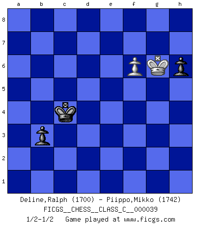 Last move : 1/2-1/2 2007 May 17 20:23:26 [Event "FICGS__CHESS__CLASS_C__000039"] [Site "FICGS"] [Date "2007.04.13"] [Round "1"] [White "Deline,Ralph"] [Black "Piippo,Mikko"] [Result "1/2-1/2"] [WhiteElo "1700"] [BlackElo "1742"] 1.c4 c5 2.g3 g6 3.Bg2 Bg7 4.Nc3 Nc6 5.d3 d6 6.e4 e6 7.Nge2 Nge7 8.O-O O-O 9.Be3 Nd4 10.f4 Nec6 11.h3 a6 12.g4 f5 13.exf5 exf5 14.g5 Rb8 15.Re1 Re8 16.Bf2 b5 17.Rb1 Be6 18.Nd5 Nxe2+ 19.Rxe2 Nd4 20.Re1 Qd7 21.Qd2 Bf7 22.b3 b4 23.h4 a5 24.h5 gxh5 25.Kf1 Rxe1+ 26.Rxe1 Re8 27.Bxd4 Bxd4 28.Nf6+ Bxf6 29.gxf6 Kf8 30.Rxe8+ Bxe8 31.Bd5 Qd8 32.Qb2 Bf7 33.Bf3 h6 34.Kg2 Kg8 35.Kh3 Kh7 36.Kh4 Qe8 37.Qg2 Bg6 38.Bxh5 Qe1+ 39.Kh3 Qe3+ 40.Qf3 Qxf3+ 41.Bxf3 Bf7 42.Kh4 Kg6 43.Kg3 Kxf6 44.Kf2 Ke7 45.Kg3 d5 46.Be2 Be8 47.Bf3 Bc6 48.Bxd5 Bxd5 49.cxd5 Kd6 50.Kh4 Kxd5 51.Kh5 Kd4 52.Kg6 Kxd3 53.Kxf5 c4 54.bxc4 Kxc4 55.Kg6 a4 56.f5 b3 57.axb3+ axb3 58.f6 1/2-1/2 English : Symmetrical variation Kingside Castling by player White (move 8) Kingside Castling by player Black (move 8) 10 pieces endgame at move 52 : White KPPP , Black KPPPPP WHITE : King + 3 Pawns BLACK : King + 5 Pawns 9 pieces endgame at move 53 : White KPPP , Black KPPPP WHITE : King + 3 Pawns BLACK : King + 4 Pawns 8 pieces endgame at move 54 : White KPPP , Black KPPP WHITE : King + 3 Pawns BLACK : King + 3 Pawns 7 pieces endgame at move 54 : White KPP , Black KPPP WHITE : King + 2 Pawns BLACK : King + 3 Pawns 6 pieces endgame at move 57 : White KPP , Black KPP WHITE : King + 2 Pawns BLACK : King + 2 Pawns 5 pieces endgame at move 57 : White KP , Black KPP WHITE : King + 1 Pawn BLACK : King + 2 Pawns This chess game ended in a draw. Follow this game move after move (download)Could we look into the head of a Chess player, we should see there a whole world of feelings, images, ideas, emotion and passion. (Alfred Binet) Kombinieren und Schwarzhandel gehören verboten. (Savielly Grigorievitsch Tartakower) Una victoria por una combinación errónea, aunque sea espectacular, me llena de horror artístico. (Wilhelm Steinitz) Un millionnaire : 'Monsieur Steinitz ! Vous ne participez aux tournois que pour l'argent, alors que moi je n'y viens que pour l'honneur.' Steinitz : 'Chacun joue pour ce qu'il n'a pas'... It is a good thing for an uneducated man to read books of quotations. (Winston Churchill)