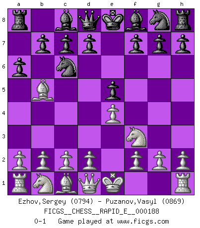 Last move : 0-1 2017 October 7 22:31:45 [Event "FICGS__CHESS__RAPID_E__000188"] [Site "FICGS"] [Date "2017.08.05"] [Round "1"] [White "Ezhov,Sergey"] [Black "Puzanov,Vasyl"] [Result "0-1"] [WhiteElo "0794"] [BlackElo "0869"] 1.e4 e5 2.Nf3 Nc6 3.Bb5 a6 0-1 This chess game has been lost on time (started : 2017.08.05 15:37:34) Ruy Lopez (Spanish Opening) Player Black won this chess game. Follow this game move after move (download)Chess is everything: art, science and sport. (Anatoly Karpov) Ich spiele ehrlich und spiele, um zu gewinnen. Wenn ich verliere nehme ich meine Medizin. (Robert James Fischer) Los tropiezos estan todos ahí en el tablero, esperando que se cometan. (Savielly Tartakover) La menace est plus forte que l'exécution. (Aaron Nimzovitch) The absolute truth is the thing that makes people laugh. (Carl Reiner)