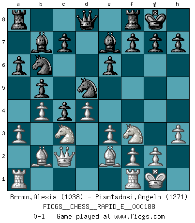 Last move : 0-1 2017 September 24 9:20:58 [Event "FICGS__CHESS__RAPID_E__000188"] [Site "FICGS"] [Date "2017.08.05"] [Round "1"] [White "Bromo,Alexis"] [Black "Piantadosi,Angelo"] [Result "0-1"] [WhiteElo "1038"] [BlackElo "1271"] 1.d4 d5 2.c4 e6 3.a3 dxc4 4.Nc3 a6 5.e3 b5 6.Nf3 Bb7 7.Be2 Nf6 8.h3 Be7 9.b4 O-O 10.Bb2 Nbd7 11.O-O Nb6 12.Qc2 Nfd5 0-1 This chess game has been lost on time (started : 2017.08.05 15:37:34) Queen's gambit declined Kingside Castling by player Black (move 9) Kingside Castling by player White (move 11) Player Black won this chess game. Follow this game move after move (download)Chess is ruthless: you've got to be prepared to kill people. (Nigel Short) Wer der Ansicht ist, daß alle Schachspieler verrückt sind, wird durch Studium des Lebens von Emil Josef Diemer nicht auf andere Gedanken kommen. (Hans Ree) Un buen sacrificio es aquel que aunque no sea necesariamente sólido, deja a tu oponente aturdido y confuso. (Rudolph Spielmann) Même si vous avez un bon coup à faire, regardez toujours s'il n'y en a pas un qui lui soit préférable. (Pedro Damiano) Panic is a sudden desertion of us, an a going over to the enemy of our imagination. (Christian Nevell Bovee)