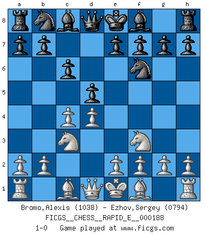 Last move : 1-0 2017 September 22 20:59:6 [Event "FICGS__CHESS__RAPID_E__000188"] [Site "FICGS"] [Date "2017.08.05"] [Round "1"] [White "Bromo,Alexis"] [Black "Ezhov,Sergey"] [Result "1-0"] [WhiteElo "1038"] [BlackElo "0794"] 1.d4 d5 2.c4 c6 3.Nf3 Nf6 4.Nc3 1-0 This chess game has been lost on time (started : 2017.08.05 15:37:34) QGD Slav : 4.Nc3 Player White won this chess game. Follow this game move after move (download)I prefer to lose a really good game than to win a bad one. (David Levy) Alle Schachspieler sollten auch ein Hobby haben. (Savielly Grigorievitsch Tartakower) El hombre es un frívolo, una creatura engañosa y como un jugador de Ajedrez, se preocupa mas por el proceso de obtener su meta que de la meta por sí misma. (Dostoyevsky) Les ravages du H expliquent la différence de niveau entre Tal et Thal [Abergel]. I take risks, sometimes patients die, but not taking risks causes more patients to die. So I guess my biggest problem is I've been cursed with the ability to do the math. (Gregory House, House M.D.)