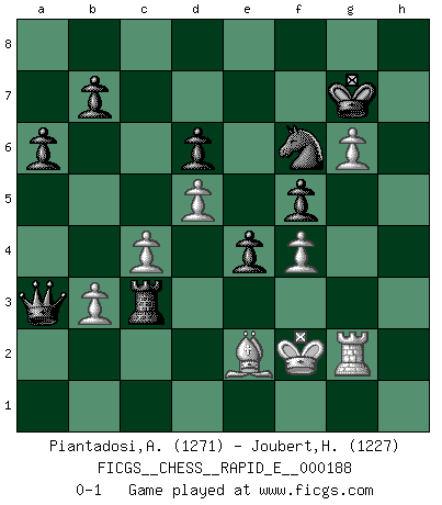 Last move : 0-1 2017 September 30 22:25:23 [Event "FICGS__CHESS__RAPID_E__000188"] [Site "FICGS"] [Date "2017.08.05"] [Round "1"] [White "Piantadosi,Angelo"] [Black "Joubert,Hennie"] [Result "0-1"] [WhiteElo "1271"] [BlackElo "1227"] 1.e4 c5 2.Nf3 e6 3.d4 cxd4 4.Nxd4 Nf6 5.Nc3 Qb6 6.Nb3 Nc6 7.Be3 Qc7 8.f4 d6 9.Be2 a6 10.O-O Be7 11.Bf3 Bd7 12.Qd2 O-O 13.Rad1 Rad8 14.Nd4 Nxd4 15.Qxd4 e5 16.Qd2 Bc6 17.Nd5 Bxd5 18.exd5 e4 19.Be2 Rc8 20.c4 Nd7 21.Bd4 f5 22.b3 Nf6 23.g4 g6 24.g5 Nd7 25.Qe3 Rf7 26.Bb2 Qb6 27.Bd4 Qb4 28.Kg2 Bf8 29.h4 Bg7 30.Bxg7 Rxg7 31.h5 h6 32.gxh6 Rh7 33.hxg6 Rxh6 34.Qg3 Kg7 35.a3 Qxa3 36.Qc3+ Nf6 37.Kf2 Rch8 38.Rg1 Rh2+ 39.Rg2 R8h3 40.Rdg1 Rxg2+ 41.Rxg2 Rxc3 0-1 Sicilian : Anderssen variation Kingside Castling by player White (move 10) Kingside Castling by player Black (move 12) Player Black won this chess game. Follow this game move after move (download)Everything is in a state of flux, and this includes the world of Chess. (Mikhail Botvinnik) Um dein Spiel zu verbessern musst du zuallererst das Endspiel studieren, denn diese kann unabhängig studiert werden. Die Eröffnung und das Mittelspiel müssen immer in Bezug gesetzt werden zum Endspiel. (José Raúl Capablanca) La última cosa en que Fischer estaba interesado era en tonterías, siempre y cuando el Ajedrez estuviera involucrado. (Elie Agur) La tactique est l'élément le plus important du milieu de jeu. (Siegbert Tarrasch) All battles are fought by scared men who'd rather be someplace else. (John Wayne in the movie In harm's way)