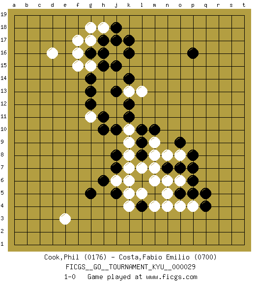 Last move : 1-0 2007 July 23 12:22:30 [Event "FICGS__GO__TOURNAMENT_KYU__000029 "] [Site "FICGS"] [Date "2007.04.13"] [Round "1"] [Black "Cook,Phil "] [White "Costa,Fabio Emilio "] [Result "1-0"] [Rating 1 "0176"] [Rating 2 "0700"] 1.q4 d16 2.p16 e3 3.g16 f17 4.h17 f16 5.h15 g18 6.j18 h18 7.k17 n4 8.o5 n5 9.o7 j16 10.j15 h16 11.k16 g15 12.j17 g17 13.h16 o6 14.p6 n6 15.n7 k10 16.k12 h12 17.k11 j11 18.l10 k9 19.l9 k8 20.l8 l7 21.m6 m7 22.m5 m4 23.l6 k7 24.k6 o4 25.p5 p4 26.q5 n8 27.p8 o8 28.p7 m8 29.l4 k5 30.j5 k4 31.g5 j6 32.g14 f15 33.g12 h13 34.g13 h14 35.h11 j12 36.j10 g11 37.h10 j14 38.k14 k13 39.j13 l13 40.h6 l5 41.j7 k6 42.j8 m6 43.o9 m9 44.m10 1-0 This go game has been lost on time (started : 2007.04.13 19:48:0) Here are the names of the openings (joseki) played in the four corners : Corner d16 : d16 g16Hoshi (Hwajeom, Seongjeom, Xingwei`) 4-4 Point. The star or hoshi (4-4) point, emphasizing influence at the potential expense of territory.Nikken Takagakari (Dukan Nop'dakeolch'im, E`r Gaojia, 2-Space High Approach). Black 2 is a light approach move. Rarely played in even games, Black 2 is typically employed in handicap games. White continues with 6-4 or 3-10. In Korean Sunjang Baduk White has a stone on 8-4. Corner q4 : q4 n4Hoshi (Hwajeom, Seongjeom, Xingwei`) 4-4 Point. The star or hoshi (4-4) point, emphasizing influence at the potential expense of territory.Nikken Takagakari (Dukan Nop'dakeolch'im, E`r Gaojia, 2-Space High Approach). White 2 is a light approach move. Rarely played in even games, White 2 is typically employed in handicap games. Black continues with 6-4 or 3-10. In Korean Sunjang Baduk Black has a stone on 8-4. Corner d4 : e3 j5Mokuhazushi (Waemok, Wai`mu`) 5-3 Point. The mokuhazushi (5-3) point was popular in the Edo period in Japan (1600 - 1867). It emphasizes influence; territorially, it is inferior to the 3-4 point. Corner q16 : p16 l13Takamoku (Gomok, Gaomu`) 5-4 Point. The takamoku (high) point (5-4). With its emphasis on influence, the 5-4 point complements the 4-4 (hoshi) point in creating an influence-oriented fuseki. Player Black won this Go (weiqi, baduk) game.Follow this game move after move (download ) I really believe that Go is destined to take the place of Chess as the leading intellectual game of the Occident, just as it has reigned supreme in the Orient for some four thousand years. (Edward Lasker, international chess master) Creativity is allowing yourself to make mistakes. Art is knowing which ones to keep. (Scott Adams)