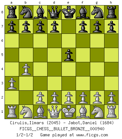 Last move : 1/2-1/2 2017 August 8 12:12:57 [Event "FICGS__CHESS__BULLET_BRONZE__000940"] [Site "FICGS"] [Date "2017.08.08"] [Round "1"] [White "Cirulis,Ilmars"] [Black "Jabot,Daniel"] [Result "1/2-1/2"] [WhiteElo "2045"] [BlackElo "1684"] 1.b4 e5 2.a3 1/2-1/2 This chess game has been lost on time (started : 2017.08.08 12:0:5) Polish (Sokolsky) opening This chess game ended in a draw. Follow this game move after move (download)Is Bobby Fischer quite sane ? (Salo Flohr) Immer nach dem besten Zug zu suchen ist ziemlich unpraktisch. (Nigel Short) El Ajedrez, como cualquier actividad creativa, solo puede existir a través del esfuerzo combinado de aquellos que tienen talento creativo y de aquellos que poseen la habilidad de organizar su trabajo creativo. (Mikhail Botvinnik) La victoire dans une partie d'Echecs appartient la plupart du temps à celui qui voit un peu plus loin que l'adversaire. (Lasker) Wipe them out. All of them. (Darth Sidious in Star Wars ep.1)
