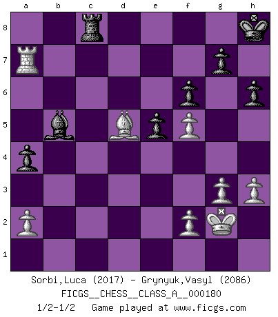 Last move : 1/2-1/2 2018 March 16 5:57:40 [Event "FICGS__CHESS__CLASS_A__000180"] [Site "FICGS"] [Date "2017.08.13"] [Round "1"] [White "Sorbi,Luca"] [Black "Grynyuk,Vasyl"] [Result "1/2-1/2"] [WhiteElo "2017"] [BlackElo "2086"] 1.e4 e5 2.Nf3 Nc6 3.Bb5 a6 4.Ba4 Nf6 5.O-O Be7 6.Re1 b5 7.Bb3 d6 8.c3 O-O 9.h3 Na5 10.Bc2 c5 11.d4 Qc7 12.Nbd2 cxd4 13.cxd4 Nc6 14.Nb3 a5 15.Be3 a4 16.Nbd2 Bd7 17.Rc1 Qb7 18.Qe2 Rfe8 19.Bd3 Rab8 20.dxe5 Nxe5 21.Nxe5 dxe5 22.Bc5 Bc6 23.Nf3 Bxc5 24.Rxc5 Nd7 25.Rc3 Nf8 26.Rec1 Bd7 27.b3 f6 28.bxa4 bxa4 29.Bc4+ Ne6 30.Bd5 Qb5 31.Bc4 Qb7 32.g3 Kh8 33.Bd5 Qb5 34.Qxb5 Bxb5 35.Kg2 h6 36.Nh4 Nd4 37.Rc7 Red8 38.Ra7 Rbc8 39.Rxc8 Rxc8 40.Nf5 Nxf5 41.exf5 1/2-1/2 Ruy Lopez : Closed Kingside Castling by player White (move 5) Kingside Castling by player Black (move 8) This chess game ended in a draw. Follow this game move after move (download)No price is too great for the scalp of the enemy King. (Koblentz) Ich habe Putins Aufstieg an die Macht beobachtet und seine Politik, die demokratischen Institutionen meines Landes zu zerstören. (Garry Kasparov) Juega la Apertura como un libro, el Juego Medio como un mago y los Finales como una máquina. (Spielmann) Je menace de comprendre la position. (Anonyme) You have to believe in yourself. (Sun Tzu)