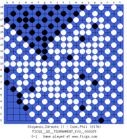 Last move : 0-1 2007 December 28 19:35:11 [Event "FICGS__GO__TOURNAMENT_KYU__000029"] [Site "FICGS"] [Date "2007.04.13"] [Round "1"] [Black "Stoyanov,Zdravko"] [White "Cook,Phil"] [Result "0-1"] [Rating 2 "0176"] 1.d16 q16 2.q4 o4 3.d14 d4 4.d12 d10 5.d6 d7 6.k18 q6 7.g12 d5 8.d17 q10 9.e7 d8 10.c8 c9 11.e9 d9 12.e6 c7 13.e15 b8 14.c15 k10 15.e13 e10 16.f14 e8 17.c13 f9 18.e11 g10 19.f8 g8 20.h9 f7 21.f6 h10 22.j10 j9 23.g14 j11 24.j12 k12 25.l11 h12 26.j13 l13 27.m12 m14 28.k14 g6 29.h7 f5 30.e5 e4 31.c11 c6 32.c5 m10 33.l9 l10 34.k8 m8 35.k6 k5 36.k4 l5 37.m5 n5 38.o5 p5 39.j5 m6 40.m7 n7 41.l7 m4 42.l3 o6 43.p7 q7 44.q8 l8 45.n8 m9 46.n9 k9 47.j7 j8 48.h6 k7 49.o8 l6 50.n3 j6 51.f12 h5 52.h4 j4 53.j3 j5 54.k2 l4 55.n4 k3 56.h2 o12 57.p9 q9 58.o10 p11 59.q12 p13 60.r11 q11 61.g3 h13 62.h14 k13 63.j15 j14 64.l15 l14 65.m13 k15 66.k16 k14 67.n14 n13 68.o14 m11 69.n11 n12 70.r9 o11 71.r7 n10 72.s8 p14 73.q14 o15 74.p15 n15 75.m16 o13 76.r13 q13 77.s12 q15 78.r15 r14 79.s14 q14 80.t13 p12 81.s10 r12 82.t11 s13 83.s6 r10 84.t9 s11 85.t7 t12 86.b12 t10 87.b14 s9 88.a13 r8 89.l7 m7 90.l1 p8 91.g13 t8 92.r5 o7 93.m2 o9 94.n8 p10 95.e6 l12 96.j1 m3 97.d6 l2 98.g5 g4 99.f4 f3 100.l17 h3 101.g1 j2 102.f2 g2 103.j17 k1 104.f10 f11 105.g11 f10 106.h8 g9 107.j13 j12 108.m13 m12 109.n14 h1 110.h16 g7 111.h7 d11 112.h9 b10 113.a9 o3 114.o2 n2 115.n3 m1 116.g15 e2 117.d3 f1 118.f16 r6 119.g17 s7 120.e17 e12 121.h18 b11 122.a11 a10 123.a15 a12 124.f18 c10 125.b16 c12 126.c17 b13 127.g19 d13 128.j19 c14 129.e19 a14 130.d18 b15 131.a17 a16 132.b18 m15 133.c19 l16 134.l19 t6 135.m18 n16 136.n17 m17 137.n19 o17 138.p16 p17 139.o18 o16 140.p16 n18 141.p19 p18 142.t15 o19 143.s16 t14 144.t17 s15 145.r17 r16 146.s18 t16 147.t19 s17 148.q18 q19 149.r19 q17 150.n1 o1 151.c4 r18 152.p3 p2 153.q1 t18 154.t5 s5 155.s4 t4 156.t3 q5 157.r3 r4 158.q2 s3 159.s2 r2 160.r1 t2 161.t1 s1 162.p1 r2 163.a7 p4 164.e7 f6 165.h8 j7 166.b6 q3 167.q1 h6 168.h8 e5 169.e6 s19 170.h9 h7 0-1 Comment by player 1 : Zdravko Stoyanov : FREE THE BULGARIAN MEDICS IN LIBYA! Here are the names of the openings (joseki) played in the four corners : Corner q4 : q4 o4 Hoshi (Hwajeom, Seongjeom, Xingwei`) 4-4 Point. The star or hoshi (4-4) point, emphasizing influence at the potential expense of territory. Ikken Takagakari (Hankan Nop'dakeolch'im, Yi Gaojia, 1-Space High Approach). Black typically responds at 6-4 or 3-10. Black 4-10 is played when Black finds play on the right side advantageous. Black 4-8 or 3-8 may be played when Black has support at top. Corner d4 : d4 d6 Hoshi (Hwajeom, Seongjeom, Xingwei`) 4-4 Point. The star or hoshi (4-4) point, emphasizing influence at the potential expense of territory. Ikken Takagakari (Hankan Nop'dakeolch'im, Yi Gaojia, 1-Space High Approach). White typically responds at 6-4 or 3-10. White 4-10 is played when White finds play on the right side advantageous. White 4-8 or 3-8 may be played when White has support at top. Corner q16 : q16 l11 Hoshi (Hwajeom, Seongjeom, Xingwei`) 4-4 Point. The star or hoshi (4-4) point, emphasizing influence at the potential expense of territory. Player White won this Go (weiqi, baduk) game. Follow this game move after move (download)Ikken tobi is never wrong. (Anonymous) Without deviation from the norm, progress is not possible. (Frank Zappa)