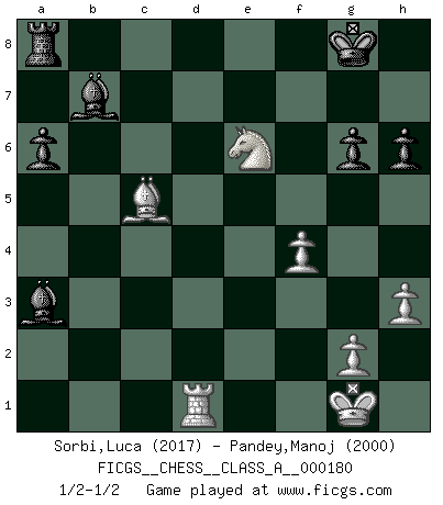 Last move : 1/2-1/2 2018 January 19 14:0:34 [Event "FICGS__CHESS__CLASS_A__000180"] [Site "FICGS"] [Date "2017.08.13"] [Round "1"] [White "Sorbi,Luca"] [Black "Pandey,Manoj"] [Result "1/2-1/2"] [WhiteElo "2017"] [BlackElo "2000"] 1.e4 c5 2.Nf3 Nc6 3.d4 cxd4 4.Nxd4 g6 5.Nc3 Bg7 6.Be3 Nf6 7.Bc4 O-O 8.Bb3 d6 9.h3 Na5 10.O-O b6 11.Re1 Bb7 12.Bg5 Nxb3 13.axb3 h6 14.Bh4 a6 15.Nd5 Nxd5 16.exd5 Re8 17.c4 b5 18.f4 Qd7 19.Bf2 bxc4 20.bxc4 e6 21.dxe6 fxe6 22.Qg4 Qf7 23.Rxe6 Rxe6 24.Qxe6 Qxe6 25.Nxe6 Bxb2 26.Rd1 Ba3 27.c5 dxc5 28.Bxc5 1/2-1/2 Sicilian : Accelerated Fianchetto, Modern variation with Bc4 Kingside Castling by player Black (move 7) Kingside Castling by player White (move 10) This chess game ended in a draw. Follow this game move after move (download)The passed Pawn is a criminal, who should be kept under lock and key. Mild measures, such as police surveillance, are not sufficient. (Aaron Nimzovich) Rubinstein ist ein Turmendspiel, welches die Götter vor tausenden von Jahren begannen. (Savielly Grigorievitsch Tartakower) El Ajedrez es el juego mas altamente simbólico, pero las agresiones estan por lo tanto aún mas francamente representadas en la partida. Tal vez comenzo como un juego de guerra; Algo como la representación de una batalla en miniatura entre las fuerzas de dos reinos. (Karl Meninger) Vous n'êtes pas toujours obligé de jouer le meilleur coup. Un coup doit être actif, entreprenant, correct et beau ! (David Bronstein) Experiences are the keys to life. (Daniel Parmet)