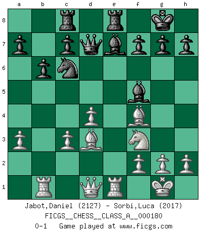 Last move : 0-1 2017 December 21 8:59:26 [Event "FICGS__CHESS__CLASS_A__000180"] [Site "FICGS"] [Date "2017.08.13"] [Round "1"] [White "Jabot,Daniel"] [Black "Sorbi,Luca"] [Result "0-1"] [WhiteElo "2127"] [BlackElo "2017"] 1.e4 e5 2.Nf3 Nf6 3.Nxe5 d6 4.Nf3 Nxe4 5.d4 d5 6.Bd3 Nc6 7.O-O Be7 8.c4 Nb4 9.Be2 O-O 10.Nc3 Bf5 11.a3 Nxc3 12.bxc3 Nc6 13.Re1 Re8 14.cxd5 Qxd5 15.Bf4 Rac8 16.Bd3 Qd7 17.Rb1 b6 0-1 Petrov : Classical attack Kingside Castling by player White (move 7) Kingside Castling by player Black (move 9) Player Black won this chess game. Follow this game move after move (download)Avoid the crowd. Do your own thinking independently. Be the Chess player, not the Chess piece. (Ralph Charell) Eine Person mit durchschnittlichem IQ kann etwa eine ELO von 2000 erreichen. (Jonathan Levitt) Tu sabes que vas a perder. Aún cuando tenía la ventaja, yo sabía que iba a perder. - al estar jugando con Fischer (Andrew Soltis) Demandez au pauvre Cg1 ce qu'il en pense. Eduard Gufeld à propos de la variante Saemisch de l'Est-Indienne. Horse racing is animated roulette. (Roger Kahn)