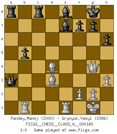 Last move : 1-0 2017 September 18 9:51:55 [Event "FICGS__CHESS__CLASS_A__000180"] [Site "FICGS"] [Date "2017.08.13"] [Round "1"] [White "Pandey,Manoj"] [Black "Grynyuk,Vasyl"] [Result "1-0"] [WhiteElo "2000"] [BlackElo "2086"] 1.e4 e5 2.Nf3 Nc6 3.Bb5 a6 4.Ba4 Nf6 5.O-O Be7 6.Re1 b5 7.Bb3 d6 8.c3 O-O 9.h3 Na5 10.Bc2 c5 11.d4 Qc7 12.Nbd2 cxd4 13.cxd4 Nc6 14.Nb3 a5 15.Be3 a4 16.Nbd2 Be6 17.a3 Bd7 18.Bd3 Qb7 19.b4 axb3 20.Qxb3 exd4 21.Nxd4 Rfb8 22.Rab1 Nxd4 23.Bxd4 Qa6 24.Nf3 Qxa3 25.Qc2 h6 26.e5 dxe5 27.Nxe5 Rc8 28.Qe2 Be8 29.Ng4 Nxg4 30.Qxg4 1-0 Ruy Lopez : Closed Kingside Castling by player White (move 5) Kingside Castling by player Black (move 8) Player White won this chess game. Follow this game move after move (download)A good sacrifice is one that is not necessarily sound but leaves your opponent dazed and confused. (Rudolph Spielmann) Wir irren allesamt, nur jeder irrt anders. (Georg Christoph Lichtenberg) Prefiero perder una partida realmente buena, que ganar una mala. (David Levy) La guerre est enfant de la passion, la passion est enfant du narcissisme et le narcissisme est l'enfant. (...) Une autre partie ? (Thibault de Vassal) The arrogant army will lose certainly the battle. (Chinese proverb)