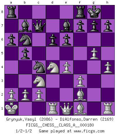 Last move : 1/2-1/2 2017 September 16 21:59:50 [Event "FICGS__CHESS__CLASS_A__000180"] [Site "FICGS"] [Date "2017.08.13"] [Round "1"] [White "Grynyuk,Vasyl"] [Black "DiAlfonso,Darren"] [Result "1/2-1/2"] [WhiteElo "2086"] [BlackElo "2169"] 1.e4 c5 2.Nf3 d6 3.d4 cxd4 4.Nxd4 Nf6 5.Nc3 a6 6.Be3 e6 7.f3 b5 8.Qd2 Nbd7 9.O-O-O Bb7 10.g4 Nb6 11.g5 Nfd7 12.Bf2 Be7 13.Kb1 Ne5 14.h4 Nec4 15.Qe1 Qc7 16.Ka1 O-O 17.Bg3 Qc5 18.Bf2 Qc7 19.Bg3 Qc5 20.Bf2 Qc7 1/2-1/2 Sicilian : Najdorf, Byrne (English) attack Queenside Castling by player White (move 9) Kingside Castling by player Black (move 16) This chess game ended in a draw. Follow this game move after move (download)Chess is a foolish expedient for making idle people believe they are doing something very clever when they are only wasting their time. (George Bernard Shaw) Du musst Deinen Gegner in einen tiefen dunklen Wald führen wo 2+2=5 ist und wo der Weg, der wieder hinausführt, nur breit genug für einen ist. (Mikhail Nekhemyevich Tal) Sin errores no puede haber brillantez. (Emanuel Lasker) Les réformistes prétendent que les progrès de la théorie conduiront à la disparition des échecs, et qu'il faut, pour leur rendre vie, en remanier les règles. En réalité, qu'exprime cette affirmation? Le mépris de l'intuition, de l'imagination et de tous les autres éléments qui font des échecs un art. (Alexander Alekhine) Real knowledge is to know the extent of one's ignorance. (Confucius)
