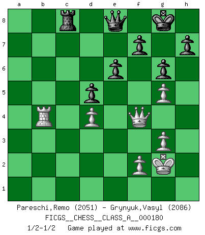 Last move : 1/2-1/2 2017 September 23 14:44:2 [Event "FICGS__CHESS__CLASS_A__000180"] [Site "FICGS"] [Date "2017.08.13"] [Round "1"] [White "Pareschi,Remo"] [Black "Grynyuk,Vasyl"] [Result "1/2-1/2"] [WhiteElo "2051"] [BlackElo "2086"] 1.d4 d5 2.Bf4 Nf6 3.Nf3 c5 4.c3 Nc6 5.e3 Qb6 6.b3 g6 7.dxc5 Qxc5 8.b4 Qb6 9.Nbd2 Bg7 10.b5 Na5 11.Be5 O-O 12.Bd4 Qe6 13.Rc1 b6 14.h4 a6 15.a4 axb5 16.Bxb5 Ba6 17.O-O Bxb5 18.axb5 Rac8 19.Re1 Rfe8 20.Qa4 Ne4 21.Ng5 Nxg5 22.hxg5 Bxd4 23.exd4 Qg4 24.Re5 Qd7 25.Re3 e6 26.Qd1 Nc4 27.Nxc4 Rxc4 28.Ra1 Qxb5 29.Ra7 Rec8 30.Qg4 Qe8 31.Qf4 Rxc3 32.Rxc3 Rxc3 33.Rb7 b5 34.g3 Rc8 35.Kg2 b4 36.Rxb4 1/2-1/2 Queen's pawn, Mason variation Kingside Castling by player Black (move 11) Kingside Castling by player White (move 17) This chess game ended in a draw. Follow this game move after move (download)Via the squares on the chessboard, the Indians explain the movement of time and the age, the higher influences which control the world and the ties which link Chess with the human soul. (Al-Masudi) Der zweitbeste Zug ist oft der einzig richtige. (Savielly Grigorievitsch Tartakower) La estratégia requiere pensar, la táctica requiere observación. (Max Euwe) Seul un grand joueur sait à quel point il joue faiblement. (Xavier Tartacover) To be champion requires more than simply being a strong player; one has to be a strong human being as well. (Anatoly Karpov)