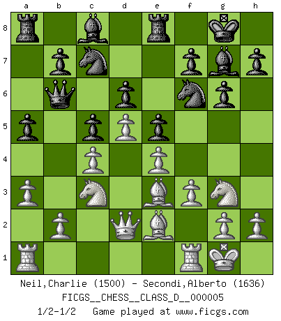 Last move : 1/2-1/2 2006 July 9 16:8:4 [Event "FICGS__CHESS__CLASS_D__000005"] [Site "FICGS"] [Date "2006.06.01"] [Round "1"] [White "Neil,Charlie"] [Black "Secondi,Alberto"] [Result "1/2-1/2"] [WhiteElo "1500"] [BlackElo "1636"] 1.d4 Nf6 2.c4 g6 3.Nc3 Bg7 4.e4 d6 5.f3 O-O 6.Nge2 Re8 7.Be3 e5 8.d5 c5 9.Qd2 a6 10.Ng3 Qb6 11.Be2 a5 12.O-O Na6 13.a3 Nc7 1/2-1/2 King's Indian : Saemisch, 5...O-O Kingside Castling by player Black (move 5) Kingside Castling by player White (move 12) This chess game ended in a draw. Follow this game move after move (download)On the chessboard, lies and hypocrisy do not survive long. (Emanuel Lasker) Spielt Blackmar-Diemer-Gambit, und das Matt kommt von selbst! (Emil Joseph Diemer) Evita las multitudes. Haz independientemente tu propio razonamiento. Trata de ser el jugador de Ajedrez, no la pieza de Ajedrez. (Ralph Charell) Toute estimation doit être constamment réévaluée. (Jacob Estrin) You think that education is too expensive ? Try ignorance. (Derek Bok)