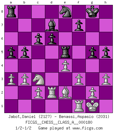 Last move : 1/2-1/2 2017 September 25 17:30:30 [Event "FICGS__CHESS__CLASS_A__000180"] [Site "FICGS"] [Date "2017.08.13"] [Round "1"] [White "Jabot,Daniel"] [Black "Benassi,Aspasio"] [Result "1/2-1/2"] [WhiteElo "2127"] [BlackElo "2031"] 1.e4 e5 2.Nf3 Nc6 3.d4 exd4 4.Nxd4 Bc5 5.Nxc6 bxc6 6.Bd3 d6 7.O-O Nf6 8.Nc3 a5 9.h3 O-O 10.Qe2 Re8 11.Be3 Bxe3 12.Qxe3 Bd7 13.b3 Qb8 14.a3 Qb6 15.Qxb6 cxb6 16.Rad1 b5 17.f3 h5 18.Rd2 Re5 19.Rfd1 g5 20.Be2 Ne8 21.Rf1 1/2-1/2 Scotch game Kingside Castling by player White (move 7) Kingside Castling by player Black (move 9) This chess game ended in a draw. Follow this game move after move (download)There are tough players and nice guys, and I'm a tough player. (Bobby Fischer) Wer der Ansicht ist, daß alle Schachspieler verrückt sind, wird durch Studium des Lebens von Emil Josef Diemer nicht auf andere Gedanken kommen. (Hans Ree) Si yo gano un torneo, yo lo gano por mí mismo. Yo hago las jugadas. Nadie me ayuda. (Bobby Fischer) Les échecs, c'est l'art d'analyser. (Mikhail Botvinnik) See no evil, hear no evil, speak no evil. (The 3 monkeys)
