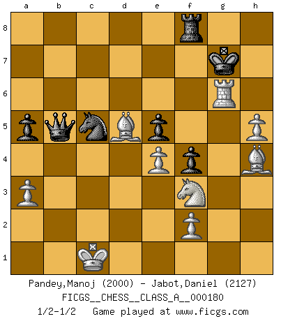 Last move : 1/2-1/2 2018 March 18 10:6:26 [Event "FICGS__CHESS__CLASS_A__000180"] [Site "FICGS"] [Date "2017.08.13"] [Round "1"] [White "Pandey,Manoj"] [Black "Jabot,Daniel"] [Result "1/2-1/2"] [WhiteElo "2000"] [BlackElo "2127"] 1.d4 Nf6 2.c4 g6 3.Nc3 Bg7 4.e4 d6 5.h3 O-O 6.Nf3 e5 7.d5 a5 8.Bg5 Na6 9.Be2 Qe8 10.g4 Nd7 11.a3 Nb6 12.Nd2 Bd7 13.h4 Nc5 14.Qc2 f5 15.gxf5 gxf5 16.h5 f4 17.O-O-O Kh8 18.Nf3 h6 19.Bh4 Nba4 20.Nb5 Bxb5 21.cxb5 c6 22.dxc6 bxc6 23.Rhg1 cxb5 24.Rg6 b4 25.R1xd6 bxa3 26.bxa3 Rb8 27.Bd1 Nb3+ 28.Qxb3 Rxb3 29.Bxb3 Nc5 30.Bd5 Qb5 31.Rxh6+ Bxh6 32.Rxh6+ Kg7 33.Rg6+ 1/2-1/2 King's Indian : Makagonov system (5.h3) Kingside Castling by player Black (move 5) Queenside Castling by player White (move 17) This chess game ended in a draw. Follow this game move after move (download)I know people who have all the will in the world, but still can't play good Chess. (Bobby Fischer) Ich war zu klein für die Schach-Schülermannschaft! (Woody Allen) Haz el enroque temprano y seguido. (Rob Sillars) Votre prénom est 'Tactique', votre deuxième prénom est 'Tactique' et votre nom est 'Tactique'. (Ken Smith) That's absurd. I love it. (Gregory House, House M.D.)