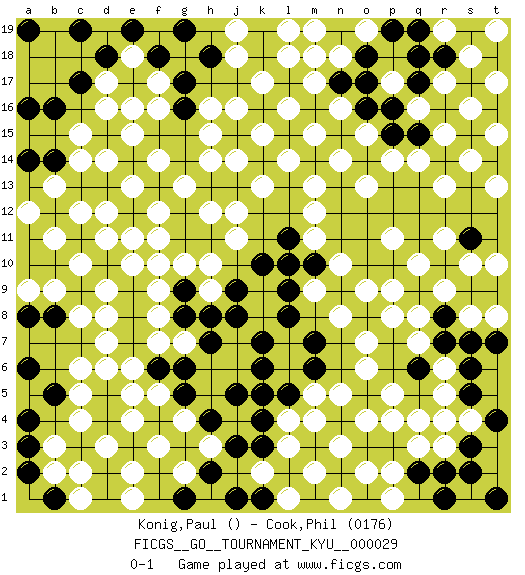 Last move : 0-1 2008 January 16 6:13:5 [Event "FICGS__GO__TOURNAMENT_KYU__000029"] [Site "FICGS"] [Date "2007.04.13"] [Round "1"] [Black "Konig,Paul"] [White "Cook,Phil"] [Result "0-1"] [Rating 2 "0176"] 1.d4 d16 2.d10 q4 3.k10 q10 4.k16 q16 5.k4 l7 6.k7 l6 7.l8 l4 8.l5 m4 9.n4 m5 10.k5 n5 11.o5 o4 12.o3 n3 13.m6 o6 14.m7 p5 15.k6 l16 16.m16 h16 17.l15 j16 18.l17 f16 19.l10 n10 20.j15 h15 21.k14 j14 22.j13 k15 23.p3 q3 24.q2 l14 25.m14 k13 26.n15 m13 27.o16 n14 28.r16 m15 29.p15 l16 30.q15 q14 31.q17 p14 32.p16 k17 33.n17 e11 34.f10 e10 35.e9 j12 36.h13 h12 37.e12 f11 38.g11 f12 39.g12 g13 40.f13 d11 41.c11 d12 42.d13 c12 43.b12 e13 44.o14 h14 45.e14 f14 46.j8 g10 47.h11 f9 48.g9 c10 49.c9 d9 50.e8 h9 51.g8 j11 52.h7 o13 53.o18 o15 54.q18 n16 55.p19 m17 56.t16 n18 57.o17 l18 58.s15 r13 59.r14 s14 60.t14 r15 61.n9 o9 62.j9 h10 63.g19 f8 64.e7 g7 65.h8 f7 66.g6 e6 67.f6 f10 68.m10 n8 69.o8 m9 70.l9 d7 71.g17 d8 72.r4 r5 73.q6 r6 74.k3 f5 75.g5 t13 76.h4 t15 77.j3 s16 78.m19 m18 79.k19 l19 80.n19 o19 81.k18 j18 82.f18 j19 83.h18 r17 84.s17 q16 85.r18 t17 86.s19 s18 87.r7 p8 88.q19 q7 89.r8 o7 90.t9 m11 91.l11 m12 92.t18 t19 93.f4 e5 94.d5 e4 95.e3 r19 96.d1 c5 97.b5 c6 98.c3 c4 99.d2 d6 100.a8 d3 101.l2 o2 102.n2 p2 103.o1 p4 104.d15 e15 105.e17 d14 106.c13 b11 107.a11 b13 108.e19 c14 109.d18 f3 110.g3 g4 111.j5 e2 112.h2 g2 113.g1 h3 114.j1 m2 115.m1 n1 116.k1 l1 117.s2 r3 118.s3 s4 119.s5 r4 120.r10 r11 121.t7 l3 122.a6 b3 123.a3 c2 124.a14 a12 125.q9 p11 126.s9 p9 127.s6 s10 128.s11 r9 129.t4 q8 130.r1 t10 131.e16 c15 132.a16 s8 133.s7 t8 134.t1 p1 135.r2 e1 136.c17 d17 137.a19 k2 138.b1 c1 139.a2 b2 140.a4 p17 141.n19 m19 142.a10 b9 143.b8 o19 144.c19 c8 145.b10 a9 146.b16 f17 147.g16 e18 148.e17 e16 149.b14 e18 0-1 Here are the names of the openings (joseki) played in the four corners : Player White won this Go (weiqi, baduk) game. Follow this game move after move (download)Beware of the clumsy double contact. (Anonymous) Memory is a crazy woman that hoards colored rags and throws away food. (Austin O'Malley)