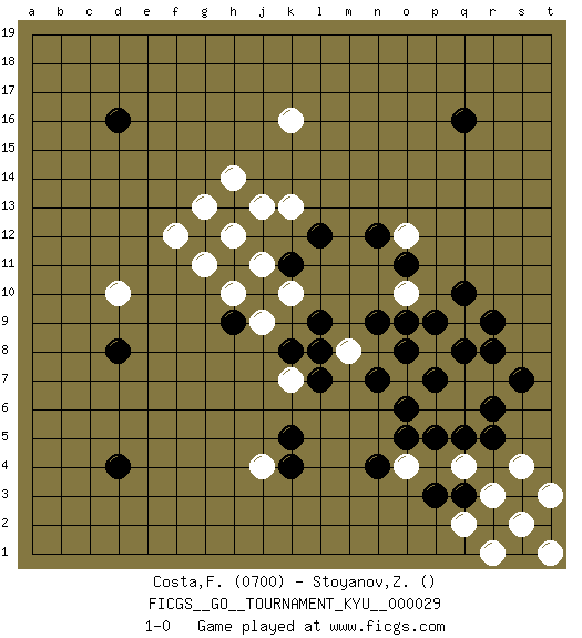 Last move : 1-0 2007 May 14 19:1:41 [Event "FICGS__GO__TOURNAMENT_KYU__000029"] [Site "FICGS"] [Date "2007.04.13"] [Round "1"] [Black "Costa,Fabio Emilio"] [White "Stoyanov,Zdravko"] [Result "1-0"] [Rating 1 "0700"] 1.d4 k10 2.q16 k16 3.k4 q4 4.d16 d10 5.q10 k13 6.n9 h10 7.l7 h12 8.d8 o12 9.n12 j4 10.k5 k7 11.k8 t1 12.o5 q7 13.q8 q9 14.p9 s2 15.r5 q6 16.p5 p8 17.r9 s4 18.o9 p6 19.o6 o7 20.n7 o10 21.o11 j11 22.o8 g11 23.p7 j9 24.l9 m8 25.l8 r3 26.q5 t3 27.r6 r7 28.s7 f12 29.r8 g13 30.h9 q2 31.p3 r1 32.q3 o4 33.n4 j13 34.k11 h14 35.l12 1-0 Here are the names of the openings (joseki) played in the four corners : Corner q4 : q4 n9 Hoshi (Hwajeom, Seongjeom, Xingwei`) 4-4 Point. The star or hoshi (4-4) point, emphasizing influence at the potential expense of territory. Corner d16 : d16 h12 Hoshi (Hwajeom, Seongjeom, Xingwei`) 4-4 Point. The star or hoshi (4-4) point, emphasizing influence at the potential expense of territory. Corner q16 : q16 o12 Hoshi (Hwajeom, Seongjeom, Xingwei`) 4-4 Point. The star or hoshi (4-4) point, emphasizing influence at the potential expense of territory. Player Black won this Go (weiqi, baduk) game. Follow this game move after move (download)You have to like to win, and to learn to recognize the errors that gave you the victory. (Pierre Audouard) The message for business people contemplating their place in the cyberspace is simple and direct: get linked or get lost. (Vic Sussman and Kenan Pollack)