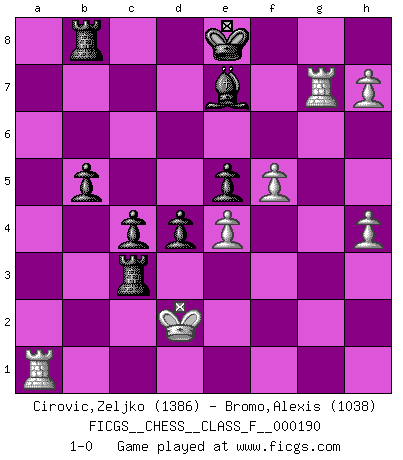 Last move : 1-0 2017 December 9 18:46:1 [Event "FICGS__CHESS__CLASS_F__000190"] [Site "FICGS"] [Date "2017.08.24"] [Round "1"] [White "Cirovic,Zeljko"] [Black "Bromo,Alexis"] [Result "1-0"] [WhiteElo "1386"] [BlackElo "1038"] 1.e4 e5 2.Nf3 Nc6 3.d4 d6 4.dxe5 dxe5 5.Qxd8+ Kxd8 6.Bd3 Nf6 7.Bg5 Be7 8.Bxf6 Bxf6 9.Nbd2 a6 10.a3 h6 11.O-O-O Be6 12.Nb3 Kc8 13.Nc5 Nd4 14.Nxd4 exd4 15.Nxe6 fxe6 16.f4 e5 17.f5 b5 18.h4 c5 19.b3 Kc7 20.Kb2 Rhb8 21.Ka2 a5 22.g4 a4 23.Rdg1 axb3+ 24.cxb3 Be7 25.g5 c4 26.gxh6 Rxa3+ 27.Kb2 Rxb3+ 28.Kc2 Rxd3 29.Rxg7 Kd7 30.Ra1 Rc3+ 31.Kd2 Ke8 32.h7 1-0 Scotch Opening Queenside Castling by player White (move 11) Player White won this chess game. Follow this game move after move (download)I believe that Chess possesses a magic that is also a help in advanced age. A rheumatic knee is forgotten during a game of Chess and other events can seem quite unimportant in comparison with a catastrophe on the chessboard. (Vlastimil Hort) Je mehr wir mit Computern analysieren, desto mehr glauben wir an Verteidigung. (Vladimir Kramnik) Un entendimiento a fondo de las continuaciones típicas del mate, hace de las combinaciones de sacrificio mas complicadas conducirlas a ellas no solo sin dificultad, sino casi de una manera natural. (Siegbert Tarrasch) Un journaliste : 'Vous préférez avoir une dame de plus sur l'échiquier ou au lit ?' Boris Spassky : 'Ca dépend de la position.' Drag your thoughts away from your troubles... by the ears, by the heels, or any other way you can manage it. (Mark Twain)