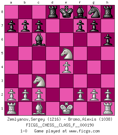 Last move : 1-0 2017 October 26 12:46:27 [Event "FICGS__CHESS__CLASS_F__000190"] [Site "FICGS"] [Date "2017.08.24"] [Round "1"] [White "Zemlyanov,Sergey"] [Black "Bromo,Alexis"] [Result "1-0"] [WhiteElo "1216"] [BlackElo "1038"] 1.e4 e5 2.Nf3 Nc6 3.Bb5 d6 4.d4 Bd7 5.Nc3 h6 6.dxe5 dxe5 7.Bxc6 Bxc6 8.Qxd8+ Rxd8 9.Nxe5 1-0 This chess game has been lost on time (started : 2017.08.24 0:10:13) Ruy Lopez : Old Steinitz defense Player White won this chess game. Follow this game move after move (download)Personally, I rather look forward to a computer program winning the world Chess Championship. Humanity needs a lesson in humility. (Richard Dawkings) Ich würde mich als ganz normalen Jungen bezeichnen [Im Alter von 12]. (Sergej Karjakin) Si un gobernante no entiende al Ajedrez, ¿como puede governar él un reinado?. (El Rey Khusros II) Même un GMI sait rarement calculer sur plus de cinq coups une attaque à sacrifices. (Rudolf Spielmann) The only thing that overcomes hard luck is hard work. (Harry Golden)
