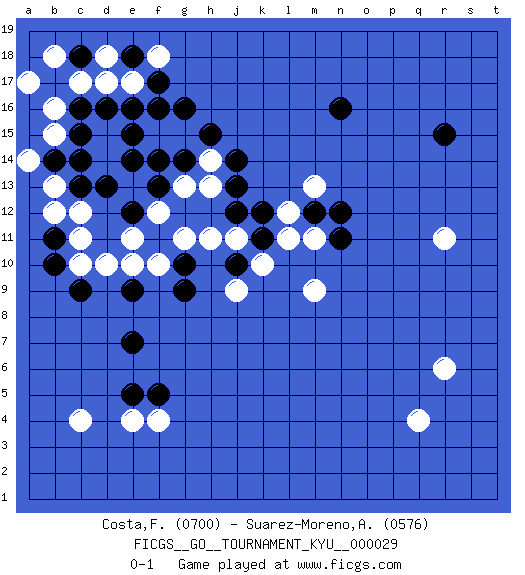 Last move : 0-1 2007 July 30 13:24:4 [Event "FICGS__GO__TOURNAMENT_KYU__000029"] [Site "FICGS"] [Date "2007.04.13"] [Round "1"] [Black "Costa,Fabio Emilio"] [White "Suarez-Moreno,Alejandro"] [Result "0-1"] [Rating 1 "0700"] [Rating 2 "0576"] 1.d16 c4 2.r15 q4 3.n16 e4 4.e7 r6 5.f5 f4 6.e5 c14 7.c15 d14 8.b14 b13 9.e14 d15 10.e15 d10 11.c9 c10 12.c13 b15 13.d13 a14 14.c14 b12 15.b11 c11 16.b10 c12 17.e9 e10 18.f11 f10 19.g9 g11 20.g10 f12 21.e12 e11 22.f13 g13 23.f14 h14 24.h15 b16 25.g16 c17 26.c18 d17 27.b17 b18 28.f16 e17 29.f17 r11 30.e18 d18 31.e16 f18 32.c16 a17 33.j13 h11 34.g14 h13 35.j14 k10 36.j12 j11 37.k11 l11 38.k12 m11 39.n11 m13 40.m12 l12 41.n12 m9 42.j10 j9 0-1 This go game has been lost on time (started : 2007.04.13 19:48:0) Here are the names of the openings (joseki) played in the four corners : Corner d16 : d16 c14 Hoshi (Hwajeom, Seongjeom, Xingwei`) 4-4 Point. The star or hoshi (4-4) point, emphasizing influence at the potential expense of territory. Ikken Kakari (Hankan Keolch'im, Yi Gua`jiao~, 1-Space Low Approach). White 2 is the standard approach move to the 4-4. Player White won this Go (weiqi, baduk) game. Follow this game move after move (download)Capture what you cut off. (Anonymous) An expert is a man who has made all the mistakes which can be made in a very narrow field. (Niels Bohr)