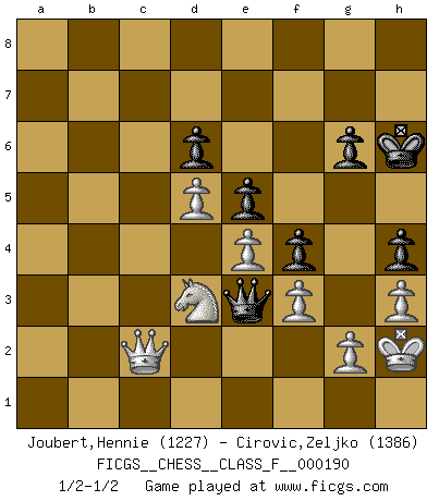 Last move : 1/2-1/2 2018 January 1 8:54:9 [Event "FICGS__CHESS__CLASS_F__000190"] [Site "FICGS"] [Date "2017.08.24"] [Round "1"] [White "Joubert,Hennie"] [Black "Cirovic,Zeljko"] [Result "1/2-1/2"] [WhiteElo "1227"] [BlackElo "1386"] 1.e4 d6 2.d4 g6 3.c4 Bg7 4.Nc3 Nf6 5.f3 O-O 6.Be3 e5 7.d5 c6 8.Qd2 cxd5 9.cxd5 Nbd7 10.Bd3 Nb6 11.Nge2 Bd7 12.O-O Rc8 13.Rac1 Ne8 14.Nb5 Bxb5 15.Bxb5 Rxc1 16.Rxc1 f5 17.Bh6 f4 18.Bxg7 Kxg7 19.Qa5 Qb8 20.h3 Nc7 21.Bd3 Rc8 22.Kh2 Nca8 23.Rxc8 Qxc8 24.Qxa7 Qc5 25.Qxb7+ Kg8 26.Qc6 Qe3 27.Qc2 Kg7 28.Nc3 Qe1 29.Ne2 Nd7 30.Qc1 Qa5 31.a3 Nab6 32.Qc3 Qa7 33.Qc6 Qb8 34.a4 Nc5 35.Bb5 Nbxa4 36.Bxa4 Nxa4 37.Qxa4 Qxb2 38.Qa6 Qb4 39.Qd3 h5 40.Qc3 Qb5 41.Nc1 Kh6 42.Qb3 Qc5 43.Nd3 Qe3 44.Qc2 h4 45.Nb4 Qe1 46.Nd3 Qe3 47.Nb4 Qe1 48.Nd3 Qe3 1/2-1/2 King's pawn Opening Kingside Castling by player Black (move 5) Kingside Castling by player White (move 12) This chess game ended in a draw. Follow this game move after move (download)Why must I lose to this idiot ? (Aron Nimzovich) Der Freibauer hat für mich eine Seele, genau wie der Mensch, Wünsche, die unerkannt in ihm schlummern, und Befürchtungen, von deren Existenz er selbst kaum ahnt. (Aaron Nimzowitsch) El Ajedrez es parte de la cultura, y si una cultura esta en decadencia, entonces también el Ajedrez declinará. (Mikhail Botvinnik) Il (Jacob Murray) ne joue pas pour le bon coup, mais pour le meilleur. (Eloi Relange) Players are not good because they find tactics, it is about the way to find the positions in which those tactics are hidden. (Luc-Olivier Leclerc)