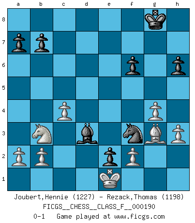 Last move : 0-1 2017 September 29 14:4:24 [Event "FICGS__CHESS__CLASS_F__000190"] [Site "FICGS"] [Date "2017.08.24"] [Round "1"] [White "Joubert,Hennie"] [Black "Rezack,Thomas"] [Result "0-1"] [WhiteElo "1227"] [BlackElo "1198"] 1.e4 e5 2.Nf3 Nc6 3.Bc4 Nf6 4.d4 exd4 5.O-O Nxe4 6.Re1 d5 7.Bxd5 Qxd5 8.Nc3 Qa5 9.Nxe4 Bd6 10.Nxd6+ Kd7 11.Nxf7 Re8 12.Rxe8 Kxe8 13.N7g5 h6 14.Qe2+ Kf8 15.Ne4 Bg4 16.Bd2 Qd5 17.Re1 Kg8 18.h3 Bh5 19.g4 Bg6 20.Bf4 Be8 21.Bxc7 Bg6 22.c4 Qd7 23.Bg3 Re8 24.Nfd2 d3 25.Nf6+ gxf6 26.Qd1 Nd4 27.Rxe8+ Qxe8 28.Kf1 Qe2+ 29.Qxe2 dxe2+ 30.Ke1 Bd3 31.Nb3 Nf3+ 0-1 Two knights defense Kingside Castling by player White (move 5) Player Black won this chess game. Follow this game move after move (download)I believe that Chess possesses a magic that is also a help in advanced age. A rheumatic knee is forgotten during a game of Chess and other events can seem quite unimportant in comparison with a catastrophe on the chessboard. (Vlastimil Hort) Mein erstes Ziel war nicht, die Partie zu gewinnen, sondern eine Figur zu opfern. -- der junge (Wilhelm Steinitz) El juego del Ajedrez no es solamente una diversión quieta; algunas cualidades muy valuables de la mente se pueden adquirir y cultivar con el, como convertirlos en habitos disponibles para toda ocasión; ya que la vida es algo así como el Ajedrez. (Benjamin Franklin) Je fais ceci parce que dans cinquante coups j'obtiendrai cela; je m'appelle Mikhail Moisevitch Botvinnik. (Botvinnik) For to win one hundred victories in one hundred battles is not the acme of skill. To subdue the enemy without fighting is the acme of skill. (Sun Tzu)