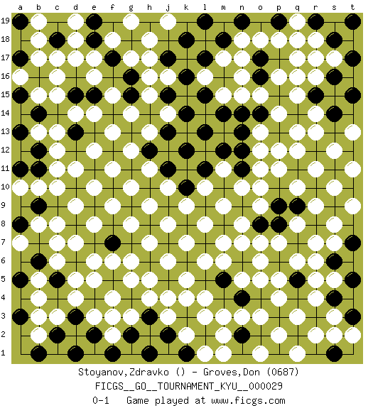 Last move : 0-1 2007 November 15 0:6:2 [Event "FICGS__GO__TOURNAMENT_KYU__000029"] [Site "FICGS"] [Date "2007.04.13"] [Round "1"] [Black "Stoyanov,Zdravko"] [White "Groves,Don"] [Result "0-1"] [Rating 2 "0687"] 1.k16 q3 2.d10 d5 3.k10 k4 4.f10 q16 5.h10 d17 6.k12 c15 7.a19 b18 8.e18 c12 9.d16 c16 10.d15 c13 11.c14 d14 12.b14 e14 13.b16 e16 14.e15 f15 15.d15 e12 16.e11 d11 17.e9 c10 18.b11 c11 19.g11 d9 20.g9 c7 21.f8 c3 22.f12 f13 23.f14 g14 24.j9 q10 25.h8 f6 26.g7 h5 27.j11 r5 28.h12 g17 29.g13 h13 30.j13 h15 31.j15 h16 32.l15 g12 33.l13 f11 34.m14 e10 35.k14 n17 36.l11 r13 37.j17 o15 38.d8 c8 39.e7 e6 40.f5 g6 41.g4 f3 42.o14 p14 43.p13 o13 44.n14 q13 45.p12 o12 46.m12 p11 47.n13 o10 48.n11 o11 49.p9 o9 50.m10 n8 51.l9 n3 52.k8 m7 53.j7 l6 54.o8 o7 55.p8 p7 56.p6 q8 57.q7 o6 58.n6 o5 59.o4 p5 60.q5 q6 61.q4 r4 62.h6 g5 63.j5 j4 64.h3 f4 65.k6 k5 66.l5 l4 67.k3 j3 68.j2 l3 69.l2 k2 70.l7 m6 71.m5 n5 72.n4 o3 73.p3 p2 74.n2 m2 75.g2 f2 76.e4 e5 77.r8 r7 78.s6 r6 79.m16 m17 80.m18 n18 81.o17 n16 82.o16 n15 83.p15 q12 84.r10 r9 85.s9 s8 86.s11 r11 87.r12 s10 88.t10 t9 89.t12 s12 90.l17 p16 91.q14 q15 92.k18 h18 93.h1 g3 94.s4 s3 95.r3 r2 96.f17 f18 97.g18 g19 98.m4 m3 99.k1 l1 100.f1 h4 101.t5 s5 102.t7 s7 103.t3 t2 104.s1 s2 105.q2 q1 106.a15 b17 107.c18 d18 108.c19 d19 109.e19 e17 110.c17 b19 111.c18 c17 112.a17 b15 113.a13 b13 114.d13 b10 115.b9 b8 116.l19 j19 117.n19 o18 118.p17 p18 119.q18 q17 120.o17 r18 121.m8 n7 122.n9 j6 123.g16 h17 124.h14 j14 125.g15 k7 126.p13 p12 127.e15 h7 128.f7 l8 129.o2 p4 130.n4 j8 131.m5 m9 132.n1 k9 133.p1 l10 134.n12 n10 135.q5 m11 136.d6 d7 137.m1 o1 138.n2 m15 139.o16 l16 140.n1 t13 141.s14 t11 142.b12 a14 143.b14 a16 144.a11 a10 145.a8 a7 146.b6 b4 147.c5 c6 148.p19 q19 149.r15 r14 150.s16 e8 151.t15 f9 152.t17 r16 153.r17 s17 154.s18 r17 155.t19 g8 156.f7 g10 157.r19 q18 158.e2 e3 159.o2 m1 160.n2 j16 161.a5 b5 162.d1 h9 163.c2 b2 164.a3 b3 165.d3 d4 166.b1 h11 167.q9 j10 0-1 Here are the names of the openings (joseki) played in the four corners : Corner d4 : d5 e9 Takamoku (Gomok, Gaomu`) 5-4 Point. The takamoku (high) point (5-4). With its emphasis on influence, the 5-4 point complements the 4-4 (hoshi) point in creating an influence-oriented fuseki. Corner q16 : q16 l15 Hoshi (Hwajeom, Seongjeom, Xingwei`) 4-4 Point. The star or hoshi (4-4) point, emphasizing influence at the potential expense of territory. Player White won this Go (weiqi, baduk) game. Follow this game move after move (download)Each step in a ladder is worth 7 points. (Anonymous) A mistake is only a mistake if you let it happen twice. Otherwise it is a learning experience. (Daniel Parmet)