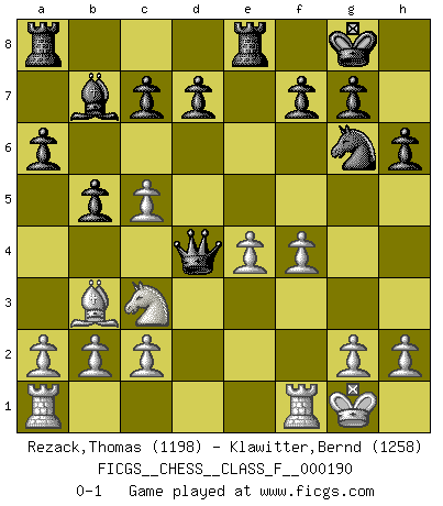 Last move : 0-1 2017 September 8 15:41:12 [Event "FICGS__CHESS__CLASS_F__000190"] [Site "FICGS"] [Date "2017.08.24"] [Round "1"] [White "Rezack,Thomas"] [Black "Klawitter,Bernd"] [Result "0-1"] [WhiteElo "1198"] [BlackElo "1258"] 1.e4 e5 2.Nf3 Nc6 3.Bb5 a6 4.Ba4 Nf6 5.O-O b5 6.Bb3 Bc5 7.Nxe5 Nxe5 8.d4 Ng6 9.dxc5 O-O 10.Nc3 Bb7 11.Qd4 Re8 12.Bg5 h6 13.Bxf6 Qxf6 14.f4 Qxd4+ 0-1 Ruy Lopez : 5.O-O Kingside Castling by player White (move 5) Kingside Castling by player Black (move 9) Player Black won this chess game. Follow this game move after move (download)I give 98 percent of my mental energy to Chess. Others give only 2 percent. (Bobby Fischer) Im Schach nämlich geht es darum, daß Ich des Gegners klein zu kriegen, sein Ego zu zerbrechen und zu zermahlen, seine Selbstachtung zu zertreten und zu verscharren und seine ganze mißachtenswerte sogenannte Persönlichkeit ein für alle Mal tot zu hacken und zu zerstampfen und dadurch die menschliche Gesellschaft von einer stinkenden Pestbeule zu befreien. Es ist ein königliches Spiel. (Robert James Fischer) Por tratar de evitar la pérdida de una pieza, muchas personas han perdido una partida de Ajedrez. (Savielly Tartakover) On peut tirer plus d'utilité d'une partie perdue que de 100 parties gagnées. (Capablanca) Mac users swear by their computers. PC users swear at their computers. (Author unknown)