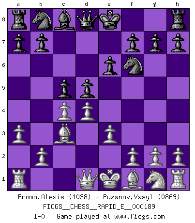 Last move : 1-0 2017 October 24 14:54:14 [Event "FICGS__CHESS__RAPID_E__000189"] [Site "FICGS"] [Date "2017.08.24"] [Round "1"] [White "Bromo,Alexis"] [Black "Puzanov,Vasyl"] [Result "1-0"] [WhiteElo "1038"] [BlackElo "0869"] 1.d4 Nf6 2.c4 e6 3.Nc3 Bb4 4.Bd2 c5 5.e3 d5 6.a3 Bxc3 7.Bxc3 1-0 Nimzo-Indian defense Player White won this chess game. Follow this game move after move (download)A chess genius has died; a loss for humanity. (Viktor Kortchnoi, about Bobby Fischer's death) In Buenos Aires ist es nicht mein vorrangiges Ziel ein starkes Turnier zu organisieren, sondern ein Turnier für Gentlemen. Ich würde nie Kamsky einladen. Ich mag keine Probleme. (Miguel Najdorf) No nos podemos resistir a la fascinación de un sacrificio ya que la pasión por los sacrificios es parte de la naturaleza de un jugador de Ajedrez. (Rudolf Spielman) Les échecs, c'est la lutte contre l'erreur. (Johannes Zukertort) Thibault, I ask for draw. Game 13876. - Sorry Ilmars, you won. (FICGS chat)