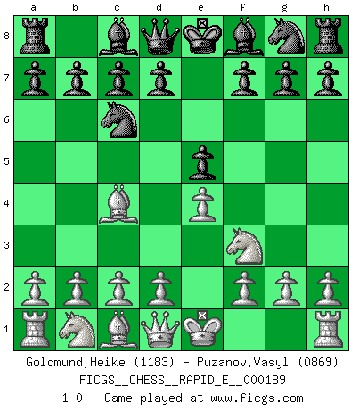 Last move : 1-0 2017 September 26 8:9:51 [Event "FICGS__CHESS__RAPID_E__000189"] [Site "FICGS"] [Date "2017.08.24"] [Round "1"] [White "Goldmund,Heike"] [Black "Puzanov,Vasyl"] [Result "1-0"] [WhiteElo "1183"] [BlackElo "0869"] 1.e4 e5 2.Nf3 Nc6 3.Bc4 1-0 King's pawn game Player White won this chess game. Follow this game move after move (download)My God, Bobby Fischer plays so simply. (Alexei Suetin) Offensichtlich kennt Kasparow nichts anderes als Schach, und ich könnte 500 weitere Spieler dieser Sorte benennen. (Judith Polgar) Un Peón pasado es un criminal, quién debe ser mantenido bajo candado y llave. Leves medidas, tales como vigilancia policiaca, no son suficientes. (Aaron Nimzovich) Les Echecs représentent une sphère d'idées créatrices basée sur la volonté des deux protagonistes. (Smyslov) The project of the man are lower than those of the sky. (Chinese proverb)