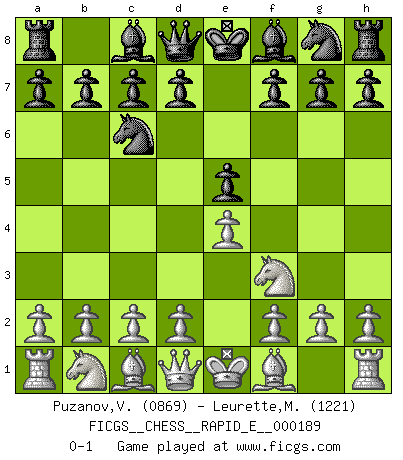 Last move : 0-1 2017 September 25 9:25:47 [Event "FICGS__CHESS__RAPID_E__000189"] [Site "FICGS"] [Date "2017.08.24"] [Round "1"] [White "Puzanov,Vasyl"] [Black "Leurette,Marc-Antoine"] [Result "0-1"] [WhiteElo "0869"] [BlackElo "1221"] 1.e4 e5 2.Nf3 Nc6 0-1 This chess game has been lost on time (started : 2017.08.24 0:11:7) King's pawn game Player Black won this chess game. Follow this game move after move (download)You may learn much more from a game you lose than from a game you win. You will have to lose hundreds of games before becoming a good player. (Jose Raul Capablanca) Ich las kürzlich ein Buch von Nietzsche. Er sagte Religion verdumme nur die Menschen. Ich stimme zu. (Robert James Fischer) Cuando tu no sabes absolutamente que mas hacer, es tiempo de entrar en pánico. (John van der Wiel) On n'a jamais que l'âge auquel on a commence à jouer aux échecs car après on cesse de vieillir. (Capablanca) There is a great deal of difference between an eager man who wants to read a book and a tired man who wants a book to read. (G.K. Chesterton)