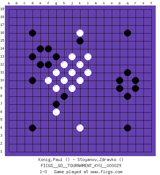 Last move : 1-0 2007 May 14 19:0:39 [Event "FICGS__GO__TOURNAMENT_KYU__000029"] [Site "FICGS"] [Date "2007.04.13"] [Round "1"] [Black "Konig,Paul"] [White "Stoyanov,Zdravko"] [Result "1-0"] 1.d4 k10 2.q16 q10 3.d16 k4 4.q4 k16 5.d10 h12 6.f12 g6 7.r10 f13 8.f14 j11 9.g13 e13 10.d13 h10 11.e12 g11 12.e14 j9 13.p10 g9 14.q11 q9 15.h8 f10 16.q8 k12 17.p9 j13 18.r9 l11 19.k15 l13 20.g7 1-0 Here are the names of the openings (joseki) played in the four corners : Corner d16 : d16 h12 Hoshi (Hwajeom, Seongjeom, Xingwei`) 4-4 Point. The star or hoshi (4-4) point, emphasizing influence at the potential expense of territory. Corner d4 : d4 g6 Hoshi (Hwajeom, Seongjeom, Xingwei`) 4-4 Point. The star or hoshi (4-4) point, emphasizing influence at the potential expense of territory. Corner q4 : q4 q9 Hoshi (Hwajeom, Seongjeom, Xingwei`) 4-4 Point. The star or hoshi (4-4) point, emphasizing influence at the potential expense of territory. Player Black won this Go (weiqi, baduk) game. Follow this game move after move (download)Don't reduce your own liberties. (Bill Taylor) Computers are like Old Testament gods; lots of rules and no mercy. (Joseph Campbell)