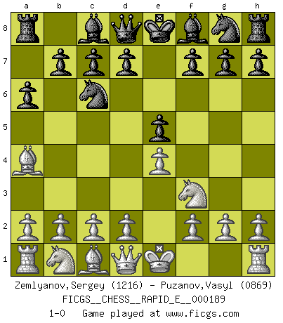 Last move : 1-0 2017 October 2 22:6:5 [Event "FICGS__CHESS__RAPID_E__000189"] [Site "FICGS"] [Date "2017.08.24"] [Round "1"] [White "Zemlyanov,Sergey"] [Black "Puzanov,Vasyl"] [Result "1-0"] [WhiteElo "1216"] [BlackElo "0869"] 1.e4 e5 2.Nf3 Nc6 3.Bb5 a6 4.Ba4 1-0 This chess game has been lost on time (started : 2017.08.24 0:11:7) Ruy Lopez Player White won this chess game. Follow this game move after move (download)There's never before been a Chess player with such a thorough knowledge of the intricacies of the game and such an absolutely indomitable will to win. I think Bobby is the greatest player that ever lived. (Lisa Lane) Obendrein hat der FIDE-Präsident den Revolutionsführer Gaddafi zum »Großmeister« ernannt, am Ende der WM. Das ist lächerlich! (Joel Lautier) La belleza de un movimiento no se refleja solo en su apariencia, sino en el pensamiento detrás de él. (Siegbert Tarrasch) Il (Jacob Murray) ne joue pas pour le bon coup, mais pour le meilleur. (Eloi Relange) First of all, we have to go back to the classical time control. (Anatoly Karpov)