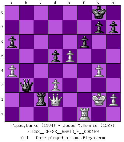 Last move : 0-1 2017 September 28 16:42:57 [Event "FICGS__CHESS__RAPID_E__000189"] [Site "FICGS"] [Date "2017.08.24"] [Round "1"] [White "Pipac,Darko"] [Black "Joubert,Hennie"] [Result "0-1"] [WhiteElo "1104"] [BlackElo "1227"] 1.e4 c5 2.Nf3 e6 3.Nc3 Nc6 4.Bb5 Nge7 5.d4 cxd4 6.Nxd4 a6 7.Nxc6 Nxc6 8.Bxc6 bxc6 9.O-O d5 10.exd5 cxd5 11.a3 Bd6 12.Qf3 O-O 13.Bf4 Bxf4 14.Qxf4 Bb7 15.Na4 Bc6 16.Nc5 Qb6 17.Qb4 Qc7 18.Nd3 Rfb8 19.Qd4 f6 20.b3 e5 21.Qg4 Bb5 22.a4 Bd7 23.Qe2 Rc8 24.Rac1 Bf5 25.g4 Bg6 26.f3 Qb6+ 27.Kg2 Rc3 28.Qd2 Rac8 29.f4 Bxd3 30.cxd3 Qxb3 31.fxe5 Rc2 32.Rxc2 Rxc2 0-1 Sicilian defense Kingside Castling by player White (move 9) Kingside Castling by player Black (move 12) Player Black won this chess game. Follow this game move after move (download)Chess is in its essence a game, in its form an art, and in its execution a science. (Baron Tassilo) Zu meiner Zeit war ein 20 jähriger ein junger Spieler, heute ist er ein Veteran. (Garry Kasparov) Aquel que ve no otra dirección en el juego que la de dar Jaque Mate a su oponente, nunca será un buen jugador de Ajedrez. (Euwe) La vérité est comme le meilleur coup aux échecs : elle existe, mais il faut la chercher. (Arturo Perez-Reverte) Opportunities multiply as they are seized. (Sun Tzu)