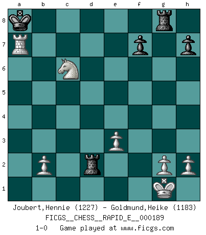 Last move : 1-0 2017 September 26 10:50:4 [Event "FICGS__CHESS__RAPID_E__000189"] [Site "FICGS"] [Date "2017.08.24"] [Round "1"] [White "Joubert,Hennie"] [Black "Goldmund,Heike"] [Result "1-0"] [WhiteElo "1227"] [BlackElo "1183"] 1.e4 d5 2.exd5 Qxd5 3.Nc3 Qa5 4.d4 Nf6 5.Bd2 c6 6.Nf3 Bf5 7.Ne4 Qc7 8.Nxf6+ gxf6 9.Be2 Nd7 10.Be3 e6 11.O-O O-O-O 12.Kh1 Bd6 13.c4 Be4 14.c5 Bf4 15.a4 Bxe3 16.fxe3 Kb8 17.a5 Nxc5 18.a6 Nxa6 19.Bxa6 bxa6 20.Rxa6 Qb7 21.Qa4 Bd3 22.Ra1 Bxa6 23.Qxa6 Rd7 24.Qa4 Rg8 25.Kg1 e5 26.dxe5 fxe5 27.Nxe5 Rd2 28.Nxc6+ Ka8 29.Qxa7+ Qxa7 30.Rxa7+ 1-0 Scandinavian (centre counter) defense Kingside Castling by player White (move 11) Queenside Castling by player Black (move 11) Player White won this chess game. Follow this game move after move (download)All I want to do, ever, is just play Chess. (Bobby Fischer) Als er Schachweltmeister wurde ließ er praktisch alle stärksten Sovietspieler für sich arbeiten. Wenn ein auch nur mittelmässiger Meister ein Spezialist für eine bestimmte Eröffnung war, wurde er von Karpov gerufen. Das wurde alles geheim gehalten. (Mikhail Moiseyevich Botvinik) El Ajedrez es un cuento de Hadas de las 1001 metidas de pata. (Savielly Tartakower) Nous sommes les pions de la mystérieuse partie d'Echecs jouée par Dieu. Il nous déplace, nous arrête, nous pousse encore, puis nous lance un à un dans la boîte du Néant. Epitaphe sur la tombe de David Janowsky (1868-1927). If only faces could talk... (Pat Summerall, Sportscaster during the Super Bowl)