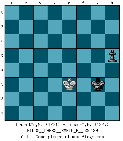 Last move : 0-1 2017 September 11 17:52:37 [Event "FICGS__CHESS__RAPID_E__000189"] [Site "FICGS"] [Date "2017.08.24"] [Round "1"] [White "Leurette,Marc-Antoine"] [Black "Joubert,Hennie"] [Result "0-1"] [WhiteElo "1221"] [BlackElo "1227"] 1.e4 c5 2.d4 cxd4 3.c3 dxc3 4.Nxc3 Nc6 5.Nf3 d6 6.Bc4 e6 7.O-O Nf6 8.Re1 a6 9.Bg5 Be7 10.e5 dxe5 11.Nxe5 Qxd1 12.Raxd1 Nxe5 13.Rxe5 h6 14.Bh4 Ng4 15.Re4 Bxh4 16.Rxg4 Bf6 17.Rg3 Bd7 18.Re3 Bc6 19.Bd5 Bxc3 20.Bxc6+ bxc6 21.Rxc3 Rc8 22.Rd6 Ke7 23.Rdxc6 Rhd8 24.Rc7+ Kf6 25.g3 Rd1+ 26.Kg2 Rcd8 27.a4 R8d2 28.Rf3+ Kg6 29.b3 f6 30.Rc6 Rd6 31.Rxd6 Rxd6 32.b4 Kf7 33.Rb3 Rb6 34.b5 axb5 35.Rxb5 Rxb5 36.axb5 Ke7 37.b6 Kd7 38.b7 Kc7 39.Kf3 Kxb7 40.Ke4 Kc6 41.f4 g6 42.h4 Kc5 43.g4 Kc4 44.h5 gxh5 45.gxh5 Kc5 46.Ke3 Kd5 47.Kd3 e5 48.Ke3 Ke6 49.Kf3 Kf5 50.fxe5 fxe5 51.Ke3 Kg5 52.Ke4 Kxh5 53.Kxe5 Kg4 54.Ke4 h5 55.Ke3 Kg3 0-1 Sicilian : Smith-Morra gambit Kingside Castling by player White (move 7) 10 pieces endgame at move 36 : White KPPPP , Black KPPPP WHITE : King + 4 Pawns BLACK : King + 4 Pawns 9 pieces endgame at move 39 : White KPPP , Black KPPPP WHITE : King + 3 Pawns BLACK : King + 4 Pawns 8 pieces endgame at move 44 : White KPP , Black KPPPP WHITE : King + 2 Pawns BLACK : King + 4 Pawns 7 pieces endgame at move 45 : White KPP , Black KPPP WHITE : King + 2 Pawns BLACK : King + 3 Pawns 6 pieces endgame at move 50 : White KPP , Black KPP WHITE : King + 2 Pawns BLACK : King + 2 Pawns 5 pieces endgame at move 50 : White KP , Black KPP WHITE : King + 1 Pawn BLACK : King + 2 Pawns 4 pieces endgame at move 52 : White K , Black KPP WHITE : King + BLACK : King + 2 Pawns 3 pieces endgame at move 53 : White K , Black KP WHITE : King + BLACK : King + 1 Pawn Player Black won this chess game. Follow this game move after move (download)Chess is a terrible game. If you have no center, your opponent has a freer position. If you do have a center, then you really have something to worry about ! (Siegbert Tarrasch) Stelle das Brett so, daß die Sonne in die Augen deines Gegners scheint. (Ruy López) Yo tuve un dolor de muelas en la primer partida. En el segundo juego, tuve un dolor de cabeza. En el tercero, tuve un ataque de reumatísmo. En la cuarta partida, no me sentía muy bien. ¿Y en el quinto juego? Bueno, ¿que acaso uno tiene que ganar todos los juegos?. (Siegbert Tarrasch) On a dit que l'homme se distingue de l'animal par le fait qu'il achète plus de livres qu'il ne peut en lire. Je voudrais suggérer qu'inclure à la liste des livres quelques livres d'échecs rendrait la distinction manifeste. (Edward Lasker) Depression is just anger without enthusiasm. (Unknown)