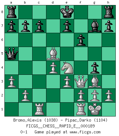 Last move : 0-1 2017 October 18 11:27:0 [Event "FICGS__CHESS__RAPID_E__000189"] [Site "FICGS"] [Date "2017.08.24"] [Round "1"] [White "Bromo,Alexis"] [Black "Pipac,Darko"] [Result "0-1"] [WhiteElo "1038"] [BlackElo "1104"] 1.d4 d5 2.c4 dxc4 3.Nc3 Nc6 4.Nf3 Nf6 5.Bg5 Bg4 6.e3 Ne4 7.Nxe4 Bxf3 8.Qxf3 f6 9.Bh4 Qd5 10.Rc1 Nb4 11.Bxc4 Qa5 12.O-O g5 13.Bg3 Bg7 14.a3 Nd5 15.Bxd5 g4 0-1 This chess game has been lost on time (started : 2017.08.24 0:11:7) Queen's gambit accepted Kingside Castling by player White (move 12) Player Black won this chess game. Follow this game move after move (download)You can only get good at Chess if you love the game. (Bobby Fischer) Als ich elf wurde, wurde ich einfach gut. (Robert James Fischer) Ciertamente el estado mental actual de Bobby Fischer es una tragedia. Uno de los mas grandes jugadores de Ajedrez del mundo -el orgullo y pena del Ajedrez Americano. (Frank Brady) Aux échecs, l'amour-propre est satisfait quand on remporte la victoire, mais il n'y a pas de honte à être battu. (Benjamin Franklin) The age of a woman doesn't mean a thing. The best tunes are played on the oldest fiddles. (Ralph Waldo Emerson)