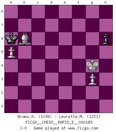 Last move : 1-0 2017 October 7 17:27:29 [Event "FICGS__CHESS__RAPID_E__000189"] [Site "FICGS"] [Date "2017.08.24"] [Round "1"] [White "Bromo,Alexis"] [Black "Leurette,Marc-Antoine"] [Result "1-0"] [WhiteElo "1038"] [BlackElo "1221"] 1.d4 d5 2.c4 e6 3.a3 Nf6 4.Nc3 Be7 5.e3 b6 6.Nf3 c5 7.Be2 Nc6 8.h3 Ne4 9.Bd2 Nxc3 10.Bxc3 cxd4 11.exd4 O-O 12.O-O a5 13.Re1 Ba6 14.b3 dxc4 15.Bxc4 Bxc4 16.bxc4 h6 17.d5 exd5 18.cxd5 Na7 19.Qb3 Bd6 20.Rad1 Qd7 21.Ne5 Bxe5 22.Bxe5 b5 23.Qg3 f6 24.Bd6 Rf7 25.Rd4 Rd8 26.Bf4 g5 27.Bd2 Nc6 28.dxc6 Qxd4 29.Bxa5 Rc8 30.c7 Qd7 31.Qb3 Kg7 32.Re4 Re7 33.Rxe7+ Qxe7 34.Qxb5 Kg6 35.Qd3+ f5 36.Qd8 Rxc7 37.Qxc7 Qxc7 38.Bxc7 Kf6 39.a4 Ke6 40.a5 Kd7 41.Bb6 Kc6 42.g3 Kb5 43.Kg2 g4 44.hxg4 fxg4 45.f3 gxf3+ 46.Kxf3 Ka6 47.Kg4 1-0 Queen's gambit declined Kingside Castling by player Black (move 11) Kingside Castling by player White (move 12) 10 pieces endgame at move 38 : White KBPPPP , Black KPPP WHITE : King + 1 Bishop 4 Pawns BLACK : King + 3 Pawns 9 pieces endgame at move 44 : White KBPPPP , Black KPP WHITE : King + 1 Bishop 4 Pawns BLACK : King + 2 Pawns 8 pieces endgame at move 44 : White KBPPP , Black KPP WHITE : King + 1 Bishop 3 Pawns BLACK : King + 2 Pawns 7 pieces endgame at move 45 : White KBPP , Black KPP WHITE : King + 1 Bishop 2 Pawns BLACK : King + 2 Pawns 6 pieces endgame at move 46 : White KBPP , Black KP WHITE : King + 1 Bishop 2 Pawns BLACK : King + 1 Pawn Player White won this chess game. Follow this game move after move (download)Chess is life. (Bobby Fischer) Ein bischen Romantik kann weder im Schach noch in der Liebe schaden. Also versuche ich mich ab und zu daran zu erinnern. (Nigel Short) No es una movida, aún la mejor movida que tu debas buscar, sino un plan comprensible. (Eugene Znosko-Borovsky) Shah mat. Le roi est mort. Cri de fierté d'un joueur venant de terrasser son adversaire, courtoisement, sans effusion de sang. You can think I'm wrong, but that's no reason to quit thinking. (Gregory House, House M.D.)