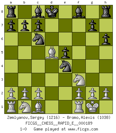 Last move : 1-0 2017 October 24 12:33:54 [Event "FICGS__CHESS__RAPID_E__000189"] [Site "FICGS"] [Date "2017.08.24"] [Round "1"] [White "Zemlyanov,Sergey"] [Black "Bromo,Alexis"] [Result "1-0"] [WhiteElo "1216"] [BlackElo "1038"] 1.e4 e5 2.Nf3 Nc6 3.Bc4 h6 4.d4 d6 5.O-O Nf6 6.dxe5 dxe5 7.Qxd8+ Kxd8 8.Bxf7 Nxe4 9.Bd5 1-0 This chess game has been lost on time (started : 2017.08.24 0:11:7) King's pawn game Kingside Castling by player White (move 5) Player White won this chess game. Follow this game move after move (download)I like the moment when I break a man's ego. (Bobby Fischer) Es gibt Leute, die glauben, alles wäre vernünftig, was man mit einem ernsthaften Gesicht tut. (Georg Christoph Lichtenberg) Coloca el contenido del tablero de Ajedrez en un sombrero, agita las piezas vigorosamente, derrámalas en el tablero desde una altura de medio metro y así obtienes el estilo de Wilhelm Steinitz. (H. E. Bird) Tous ces prétendus hommes politiques sont les pions, les Cavaliers, les Tours ou les Fous d'une partie d'échecs qui se jouera tant qu'un hasard ne renversera pas l'échiquier. (Honoré de Balzac) There are more things in heaven and earth than practically anywhere else. (Unknown)