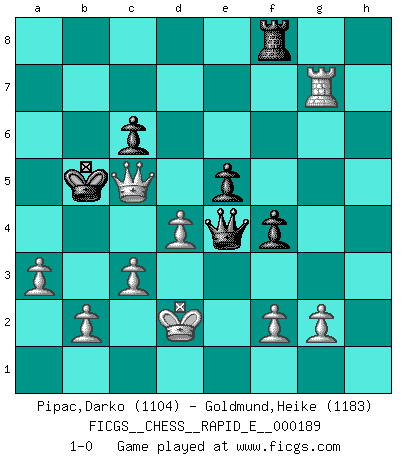 Last move : 1-0 2017 October 7 20:59:53 [Event "FICGS__CHESS__RAPID_E__000189"] [Site "FICGS"] [Date "2017.08.24"] [Round "1"] [White "Pipac,Darko"] [Black "Goldmund,Heike"] [Result "1-0"] [WhiteElo "1104"] [BlackElo "1183"] 1.e4 d5 2.exd5 Qxd5 3.Nc3 Qa5 4.Nf3 Nf6 5.h3 Bf5 6.a3 c6 7.d4 Nbd7 8.Bd2 e6 9.Ng5 h6 10.Nge4 Nxe4 11.Nxe4 Qc7 12.Ng3 Bg6 13.c3 Bd6 14.Qf3 Nf6 15.Bd3 Bxd3 16.Qxd3 g5 17.Ne4 Nxe4 18.Qxe4 O-O-O 19.O-O-O Rde8 20.h4 f5 21.Qd3 Bf4 22.Kc2 Bxd2 23.Qxd2 f4 24.hxg5 hxg5 25.Qe2 Rxh1 26.Rxh1 Qg7 27.Qg4 Qg6+ 28.Kb3 Kc7 29.Rh5 e5 30.Rxg5 Qf7+ 31.Kc2 Qh7+ 32.Kb3 Qf7+ 33.Kc2 Qh7+ 34.Kd2 Qe4 35.Rg7+ Kb6 36.Qd7 Rf8 37.Qxb7+ Ka5 38.Qxa7+ Kb5 39.Qc5+ 1-0 Scandinavian (centre counter) defense Queenside Castling by player Black (move 18) Queenside Castling by player White (move 19) Player White won this chess game. Follow this game move after move (download)Let the perfectionist play postal. (Yasser Seirawan) Man wirke der falschen Auffassung entgegen, als ob jeder Zug Unmittelbares zu leisten habe; auch Werte- und Ruhezüge haben ihre Existenzberechtigung. (Aaron Nimzowitsch) El jugador táctico debe saber que hacer cuando algo se debe de hacer. El estratégico debe saber que hacer cuando nada se debe de hacer. (Savielly Tartakover) On est toujours la mazette de quelqu'un d'autre. (Anonyme) Fear is the path to the dark side. Fear leads to anger; anger leads to hate; hate leads to suffering. I sense much fear in you. (Master Yoda in Star Wars ep.1)